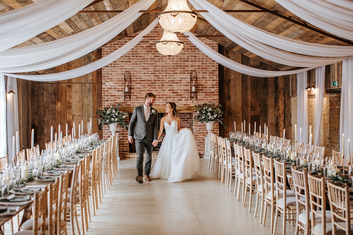 Wedding breakfasts can be held in either The Main Barn, which seats 90 guests with round or long rustic tables, or The Byre, which accommodates up to 130 guests. Both spaces benefit from ample natural light and can be styled for formal or relaxed dining.