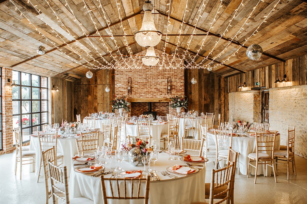 The Byre is another indoor option. It features an Italian-imported oak ceiling, three elegant chandeliers, and a wood burner, creating a warm and inviting atmosphere.