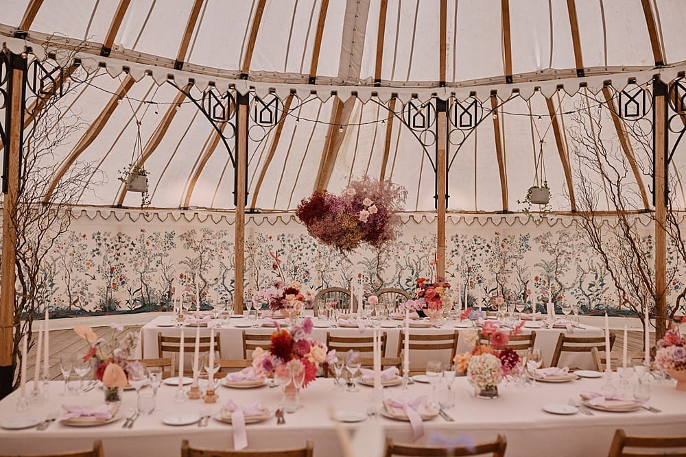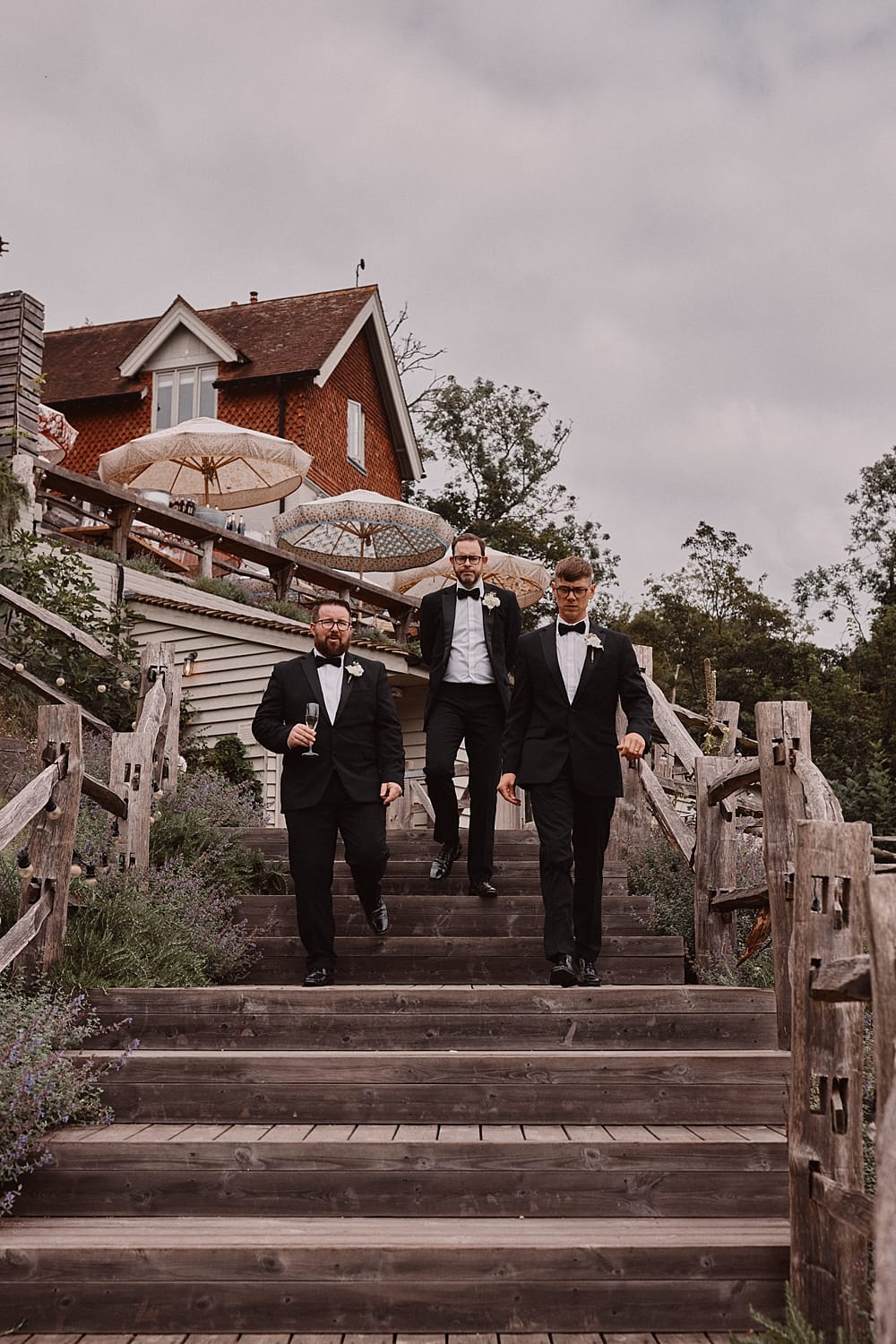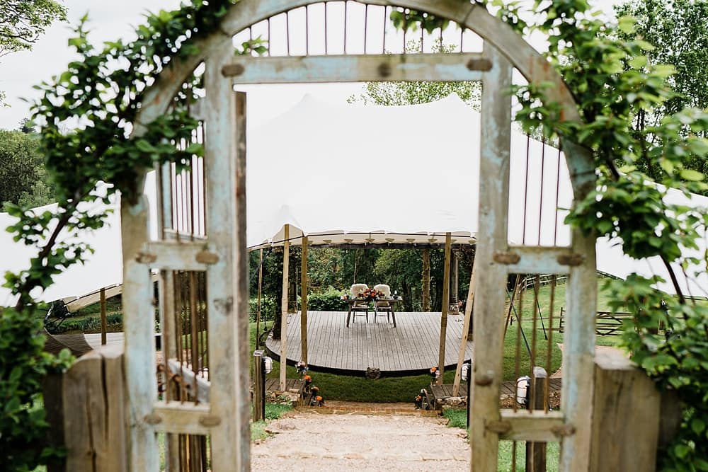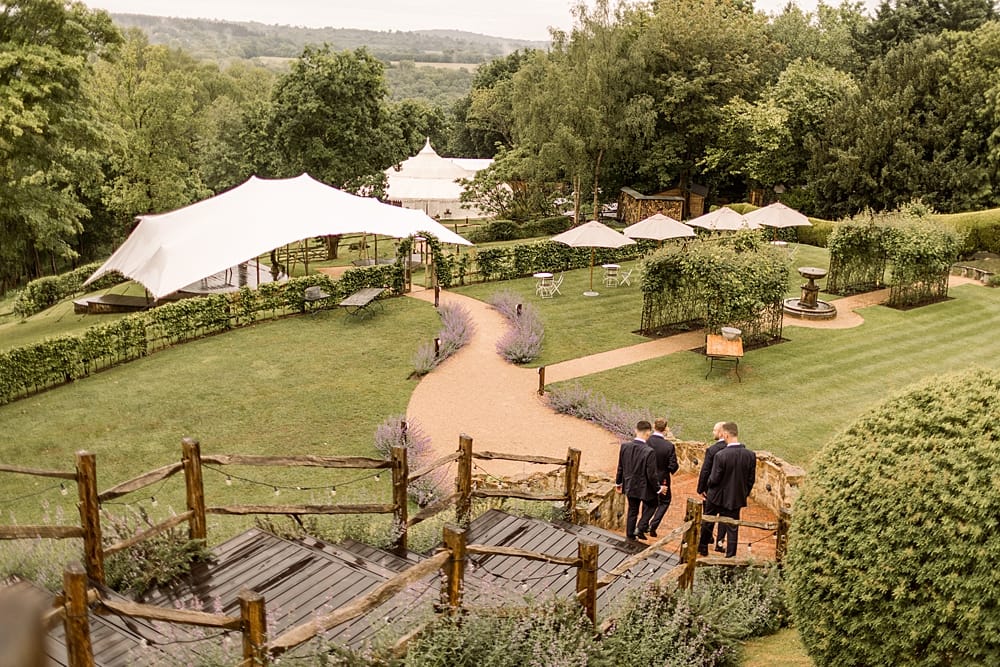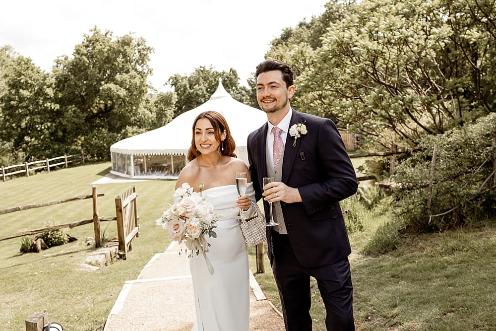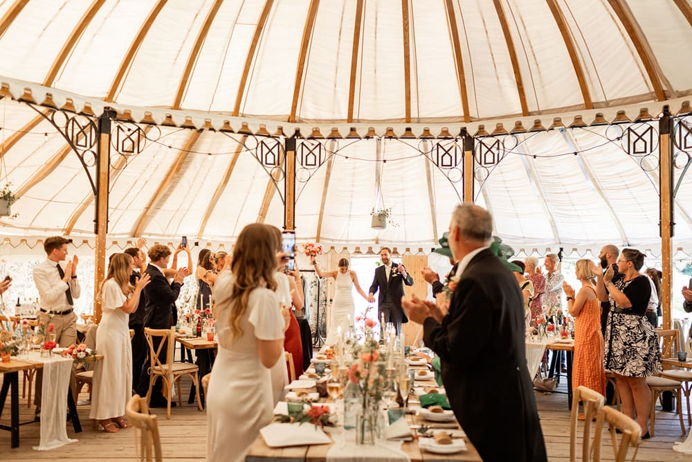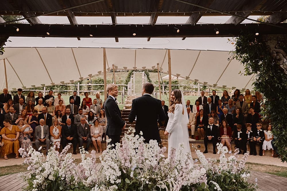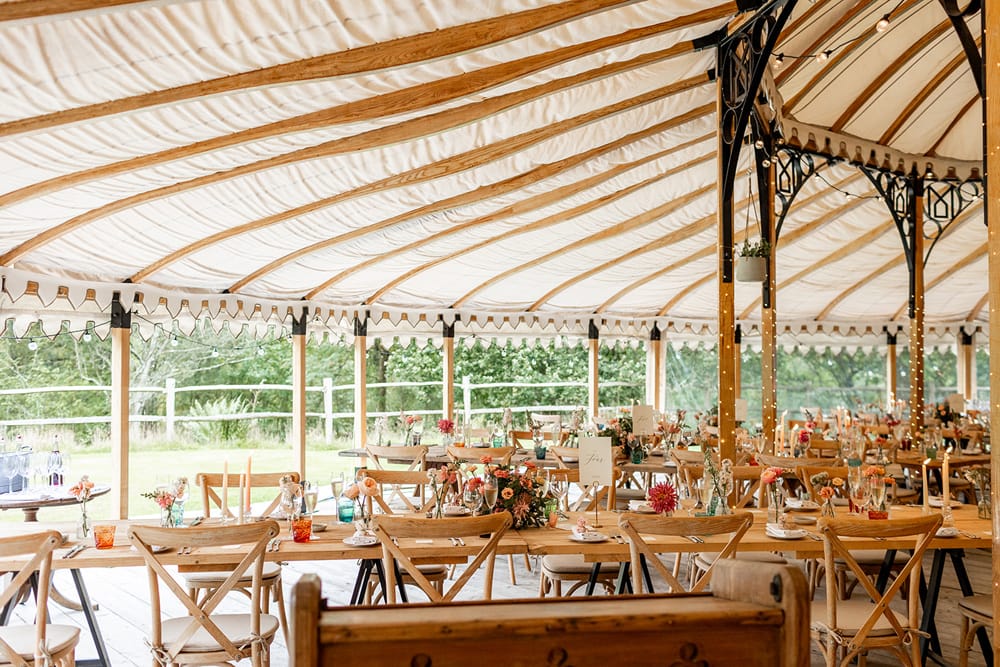 Guests gather on the terrace to take in sweeping views of the Kent countryside, with a perfect sightline down to the Amphitheatre and Grand Pavilion. The ceremony unfolds in the Amphitheatre itself, a rustic wooden structure with classic features, offering a striking and intimate setting for exchanging vows. The wood-panelled, tiered auditorium ensures every guest enjoys an uninterrupted view.