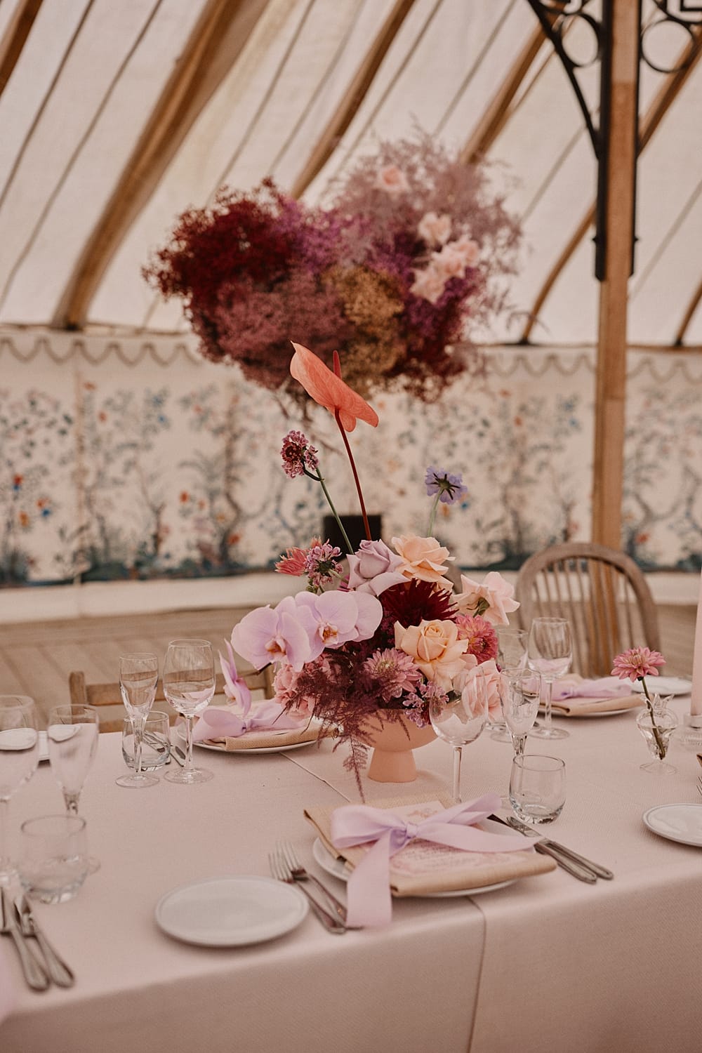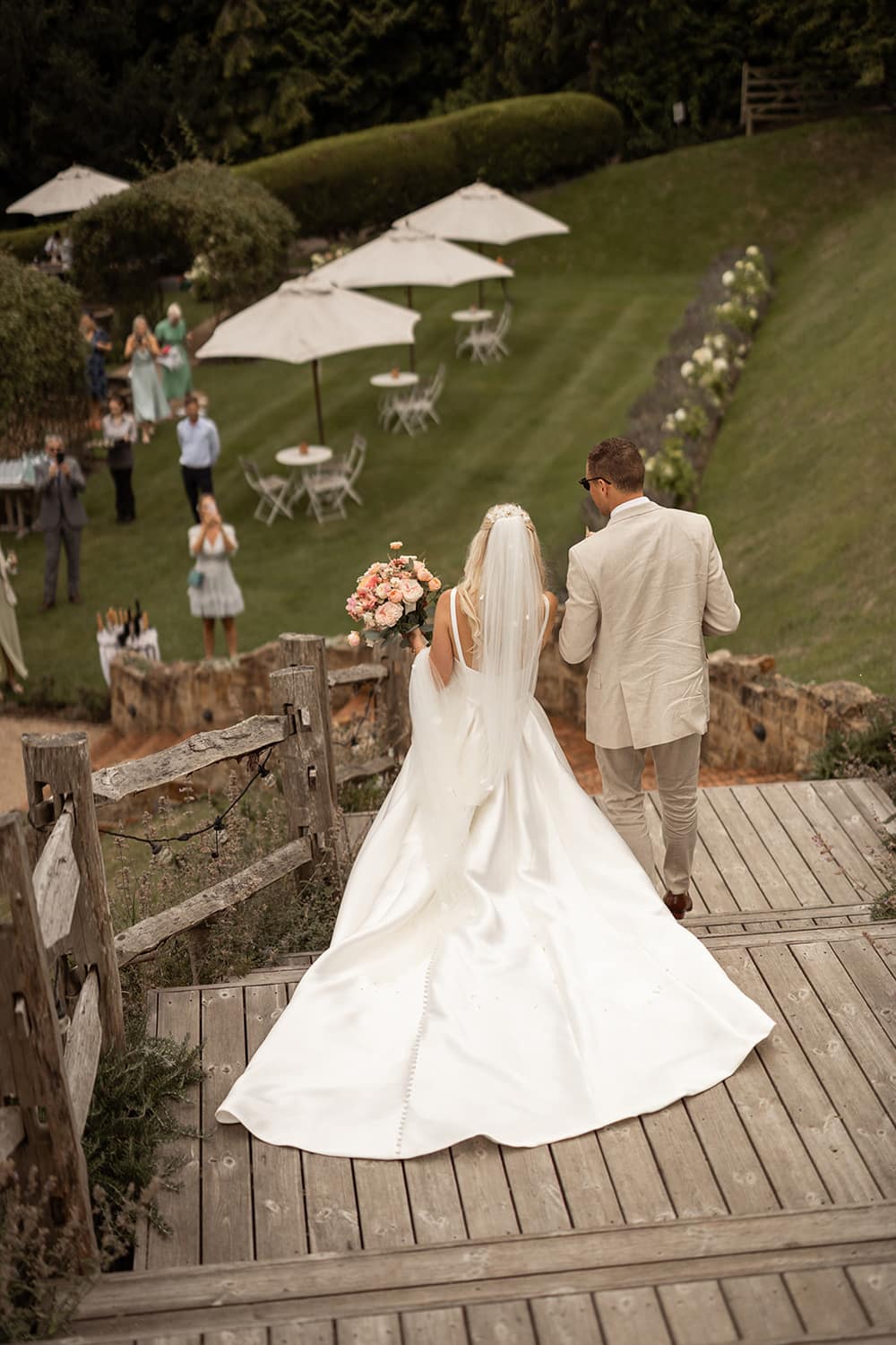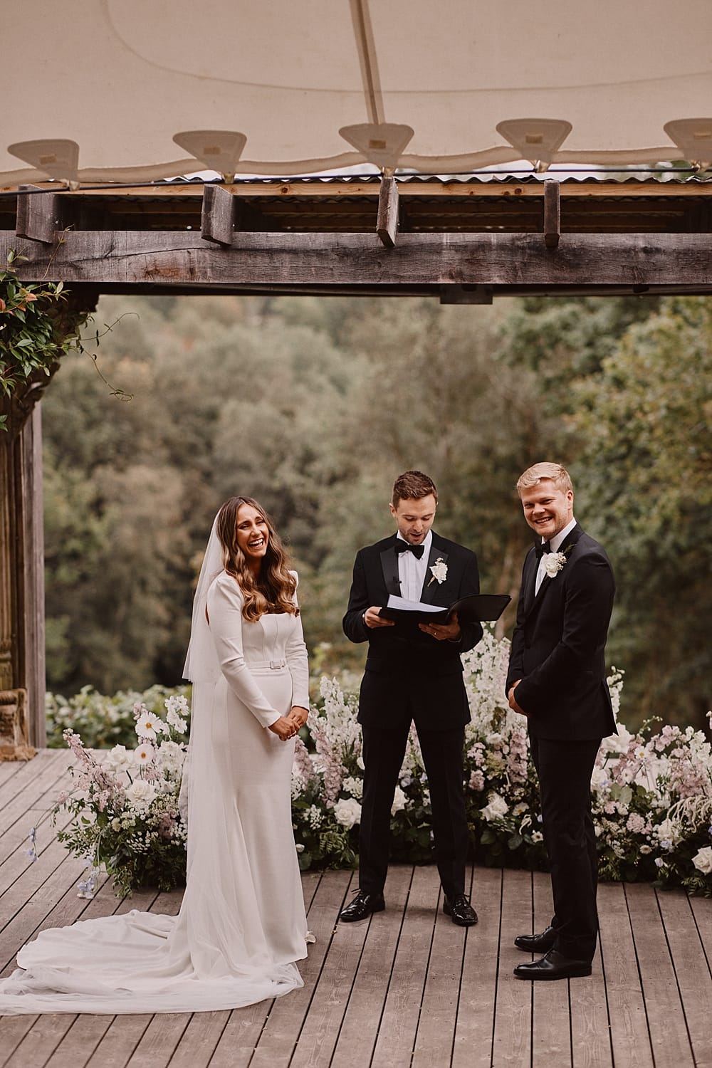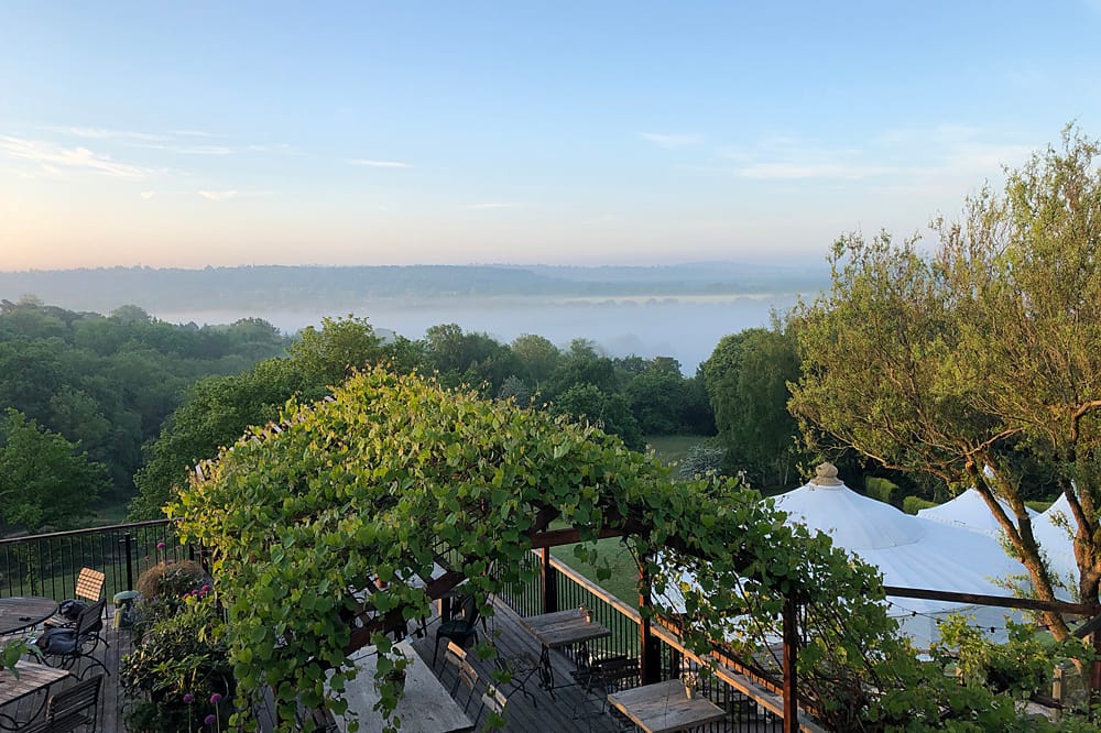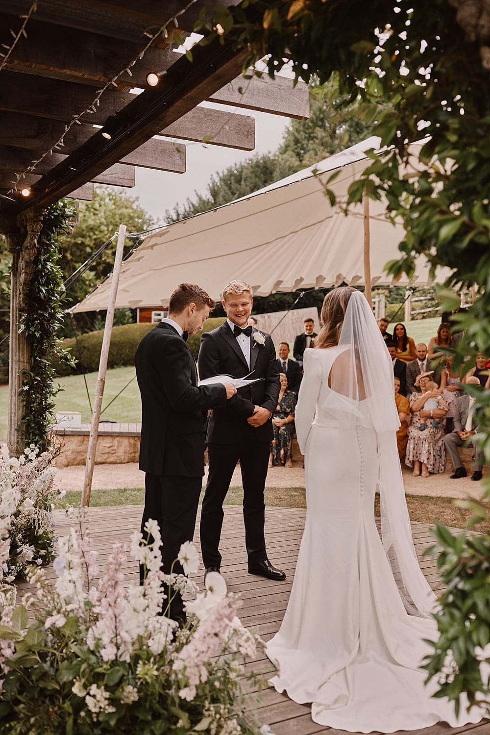 Guests gather on the terrace to take in sweeping views of the Kent countryside, with a perfect sightline down to the Amphitheatre and Grand Pavilion. The ceremony unfolds in the Amphitheatre itself, a rustic wooden structure with classic features, offering a striking and intimate setting for exchanging vows. The wood-panelled, tiered auditorium ensures every guest enjoys an uninterrupted view.