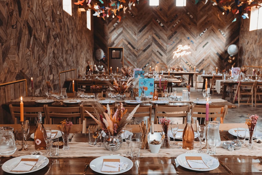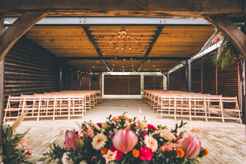 The Canary Shed offers a stunning and versatile ceremony space that seamlessly blends indoor comfort with outdoor charm. Couples can exchange vows in a fully licensed legal ceremony or opt for a private blessing in a picturesque outdoor setting. A wooden pergola is the focal point, complemented by sheltered seating that ensures guests are comfortable while immersed in the venue’s natural beauty. Designed for year-round celebrations, the space features bi-fold doors that open to create an airy, open-plan feel, bringing the outdoors in. When closed, it transforms into a warm and intimate setting, providing a cosy yet elegant atmosphere, no matter the season.