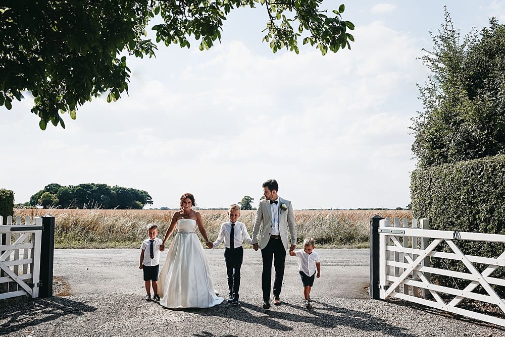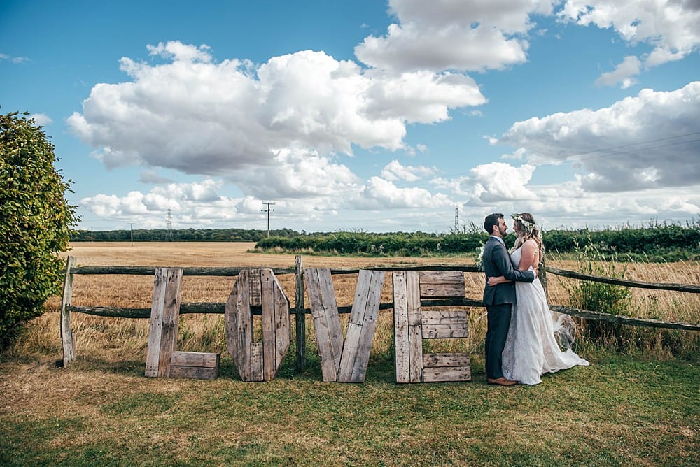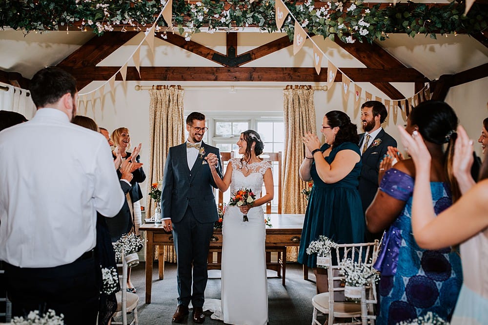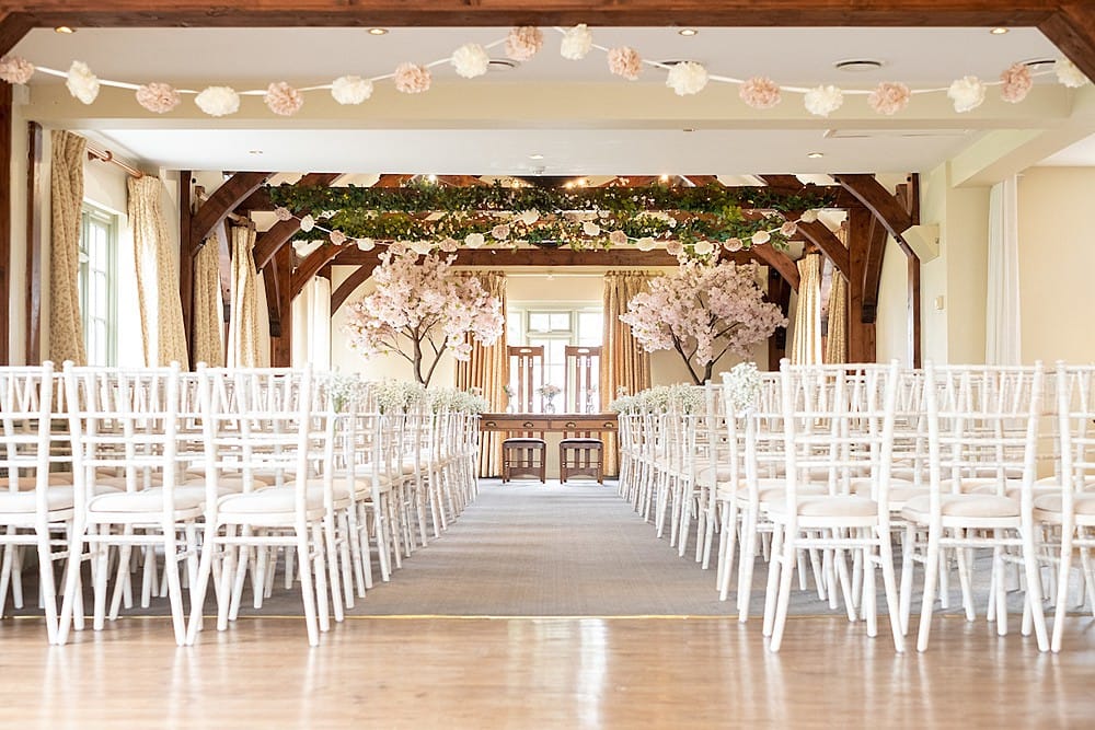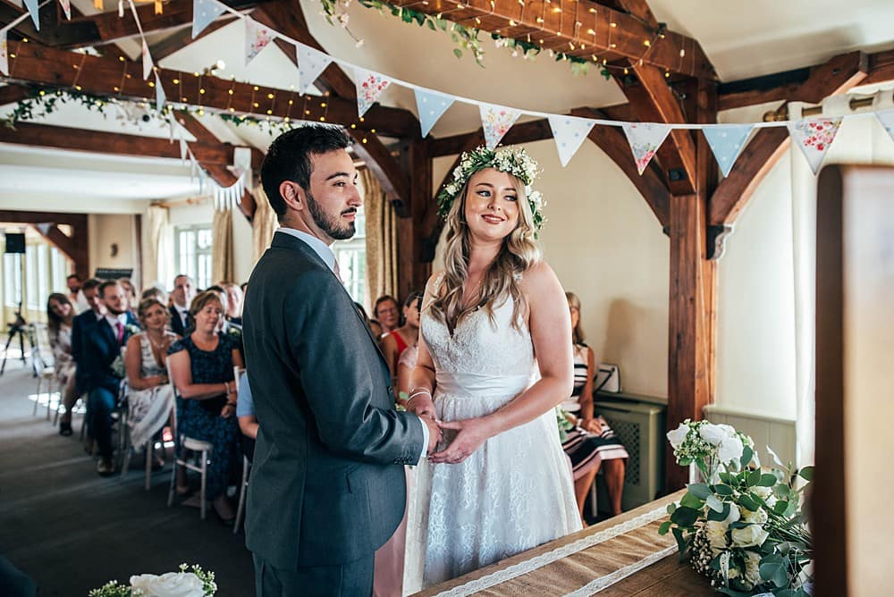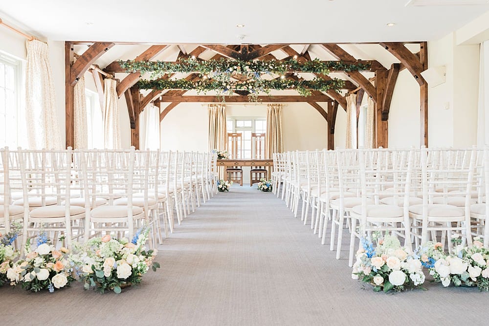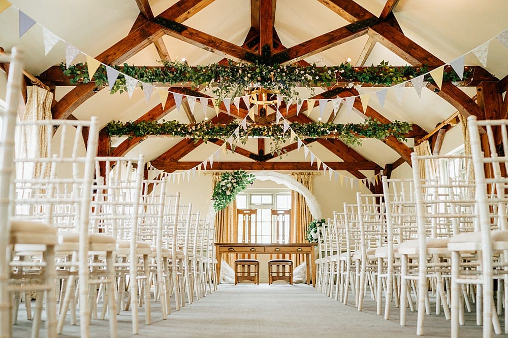 The ceremony area itself is comfortably large without feeling barn-like and retains a sense of intimacy. With traditional beams decked with greenery and wild flowers, offset with rustic bunting, the ceremony area is light and airy with views over the garden and fields.