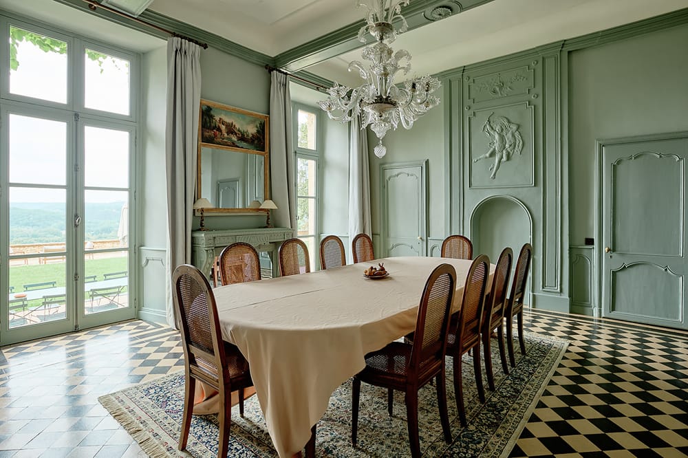 The spacious château interior offers a large main salon with access out onto the upper terrace overlooking the river. There are countless spaces in which to hold your ceremony or dine externally.
