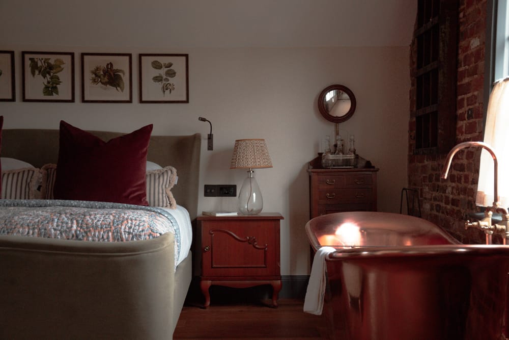The Cobnut Suite, with its copper roll-top bath and countryside views, is a romantic setting for newlyweds. The next morning, guests can enjoy a relaxed breakfast in the Sidney Room or individually in their rooms.