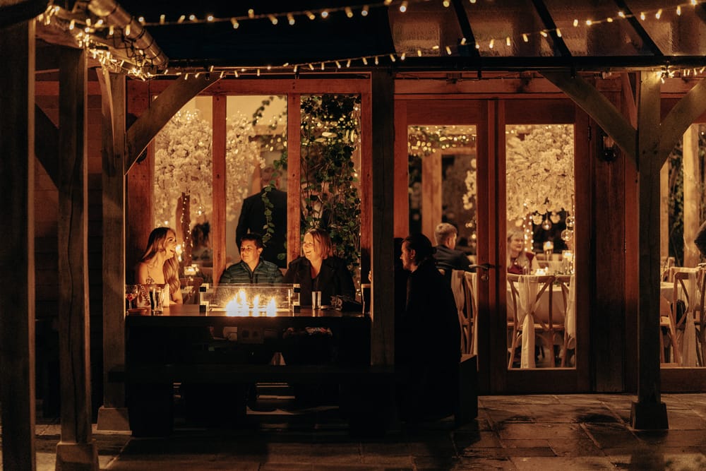 Floor-to-ceiling windows fill the rooms with soft, natural light, while fairy lights and trailing bougainvillaea add a gentle glow. Whether in spring sunshine or on a winter evening, the setting always feels inviting. Outside, fire pit tables make an ideal spot for guests to unwind and share stories as the night draws in.