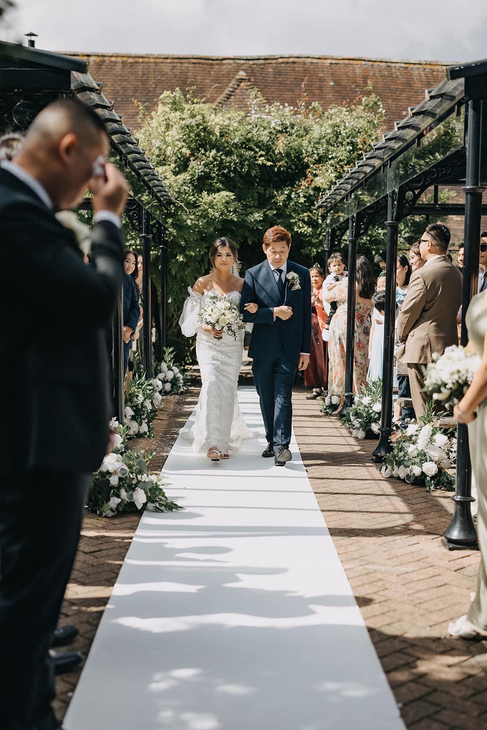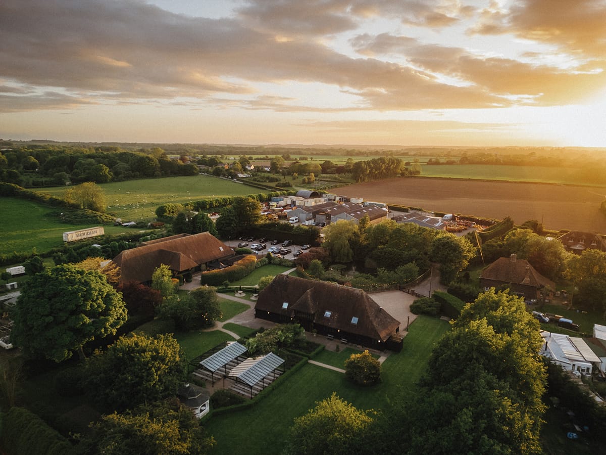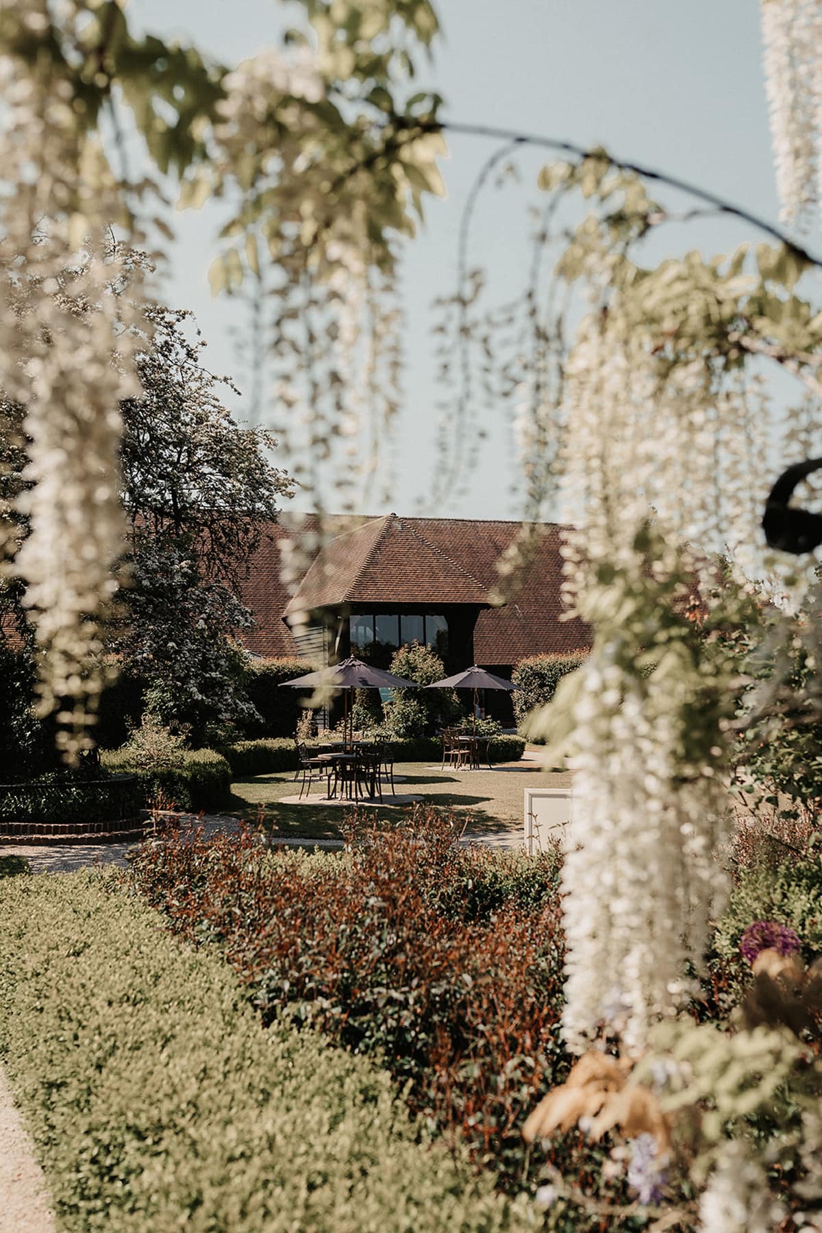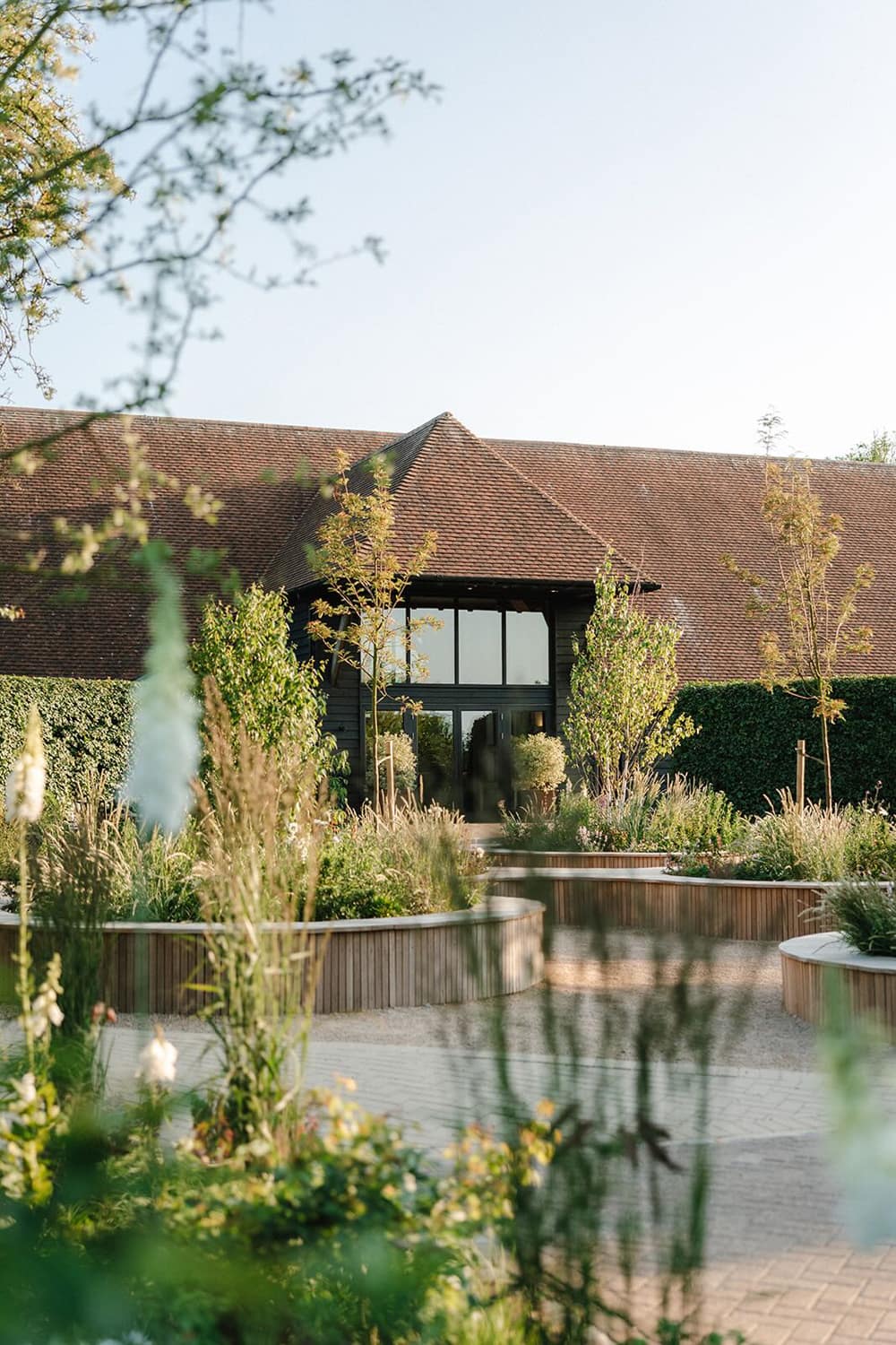 The Old Kent Barn lies in the rural Kent countryside, within the quaint village of Swingfield, close to Canterbury and Folkestone. The venue encompasses two barns set amidst three acres of meticulously maintained grounds and farmland. Highlights include a wilding water garden, an illuminated orchard, and a wisteria-lined aisle.