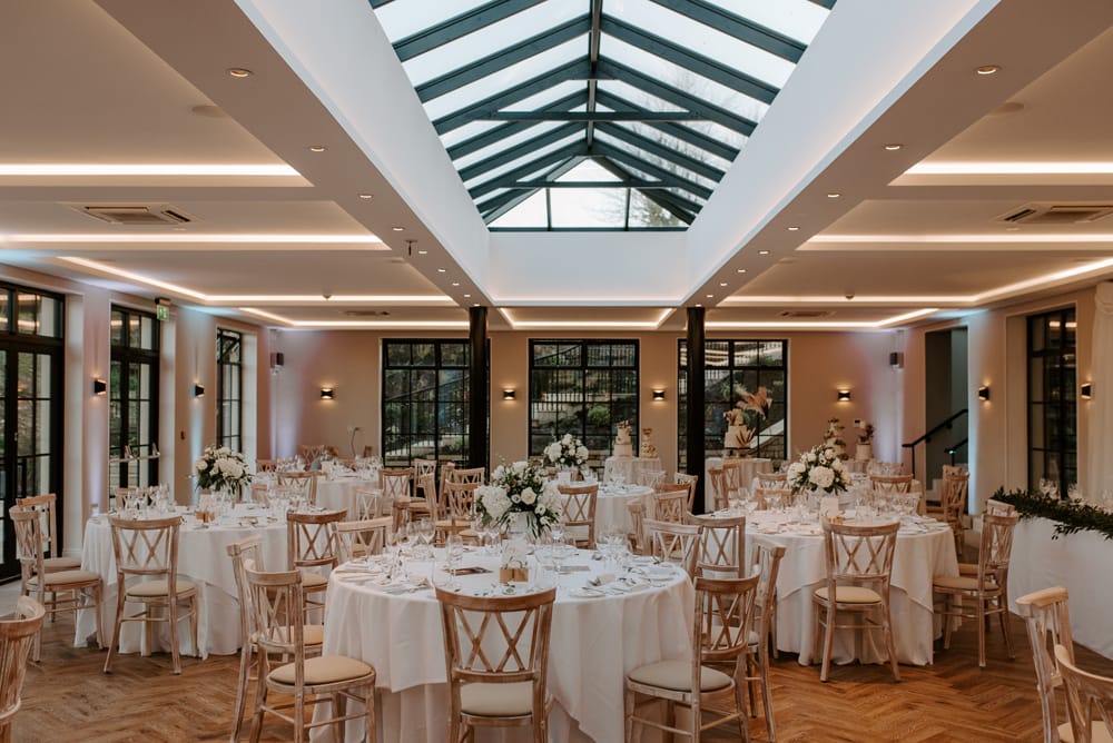 After sealing your promises, step onto the open-air staircase for your confetti moment before wandering into the gardens and vineyards for photographs surrounded by natural beauty. The terrace offers sweeping views of the church spire, woodland, and meadows beyond, stunning in every season. Inside the Orangery, floor-to-ceiling windows frame the grounds as you enjoy a wedding breakfast in bright, contemporary surroundings. Later, the Bartlett Bar and Lounge invites you to dance the night away, while the Terrace’s outdoor kitchen tempts guests with delicious evening treats.