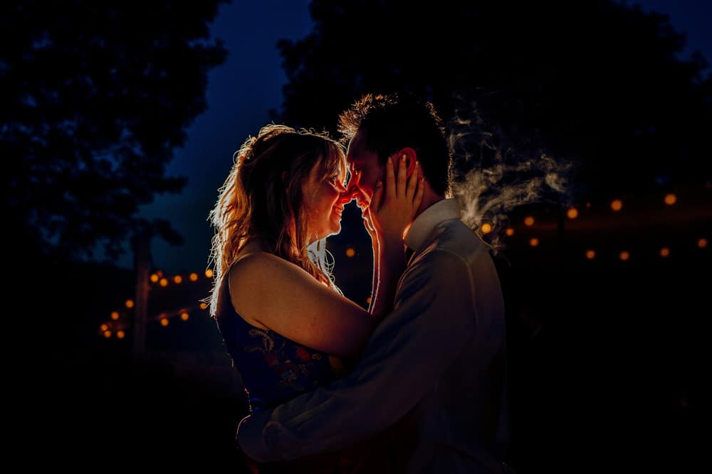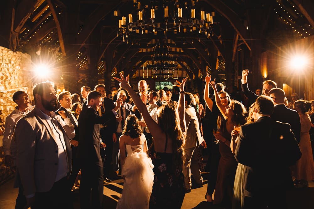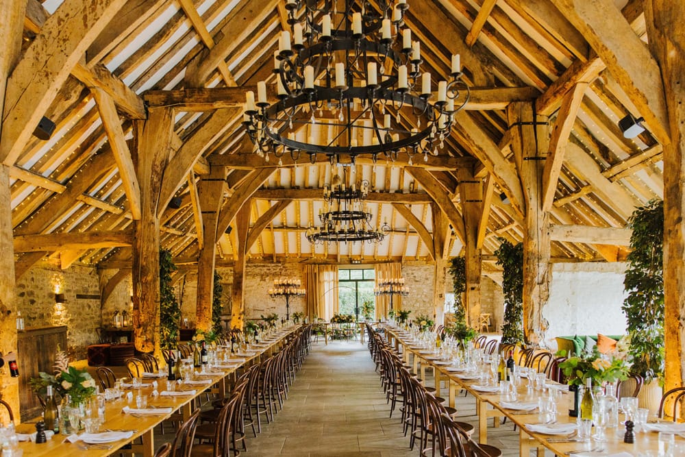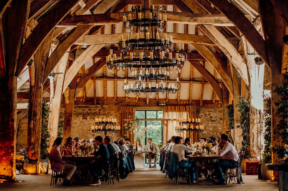 Inside, the barn’s majestic scale comes into its own. It is lit with uplights on the flagstone floor and fairy lights woven through the beams that support the barn’s elevated ceiling. Huge medieval chandeliers refract candlelight around the room.