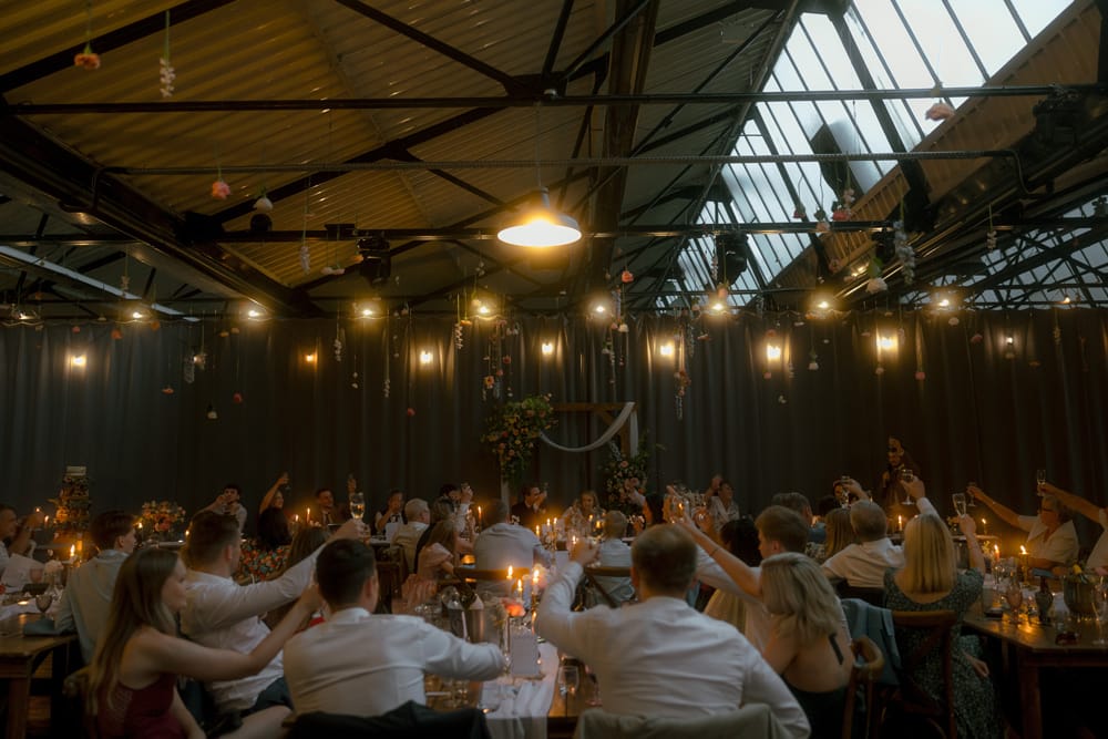 The Bowers Suite transforms effortlessly from ceremony to reception. Its industrial roots are reflected in features like large factory windows that bathe the room in natural light by day and create a warm glow at night. The space accommodates gatherings from 60 to 400 guests and can be divided into three sections with elegant drapes to create a theatrical reveal for guests. An outdoor private area is often used for drinks receptions and photography during summer.