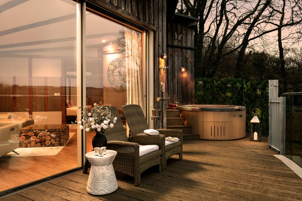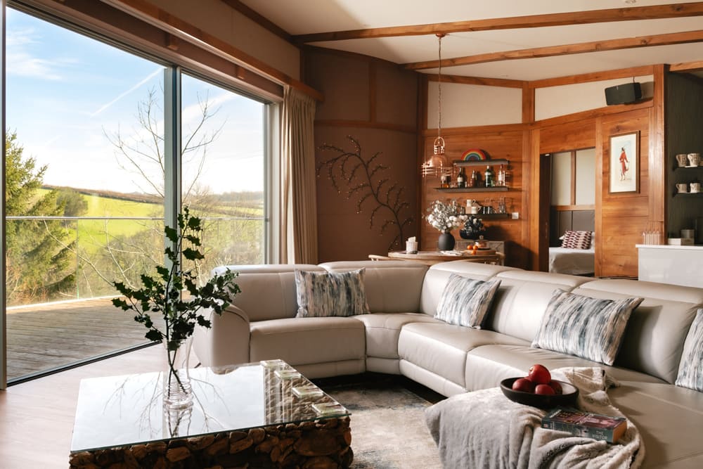 An intimate wedding venue for up to 14 guests and linked to the Tree House by a romantic wooden walkway. With its frameless glass balustrade and 8-metre-wide glass doors across two sides, The Nest appears to float above the countryside.
