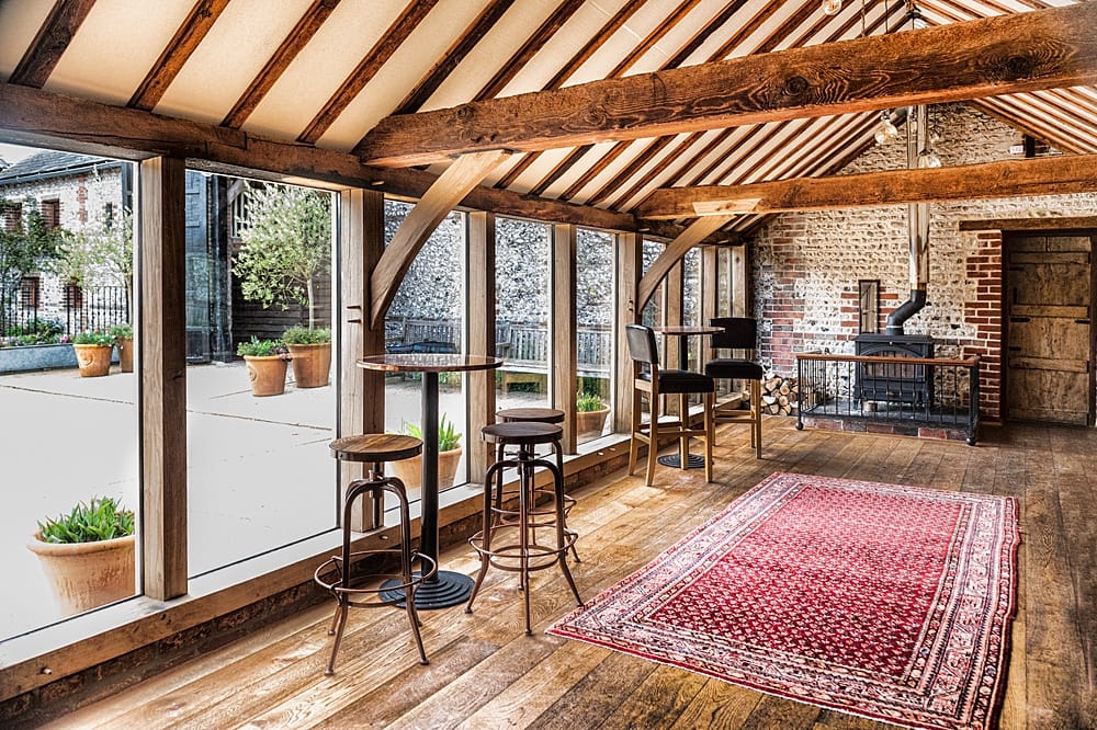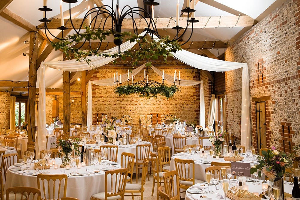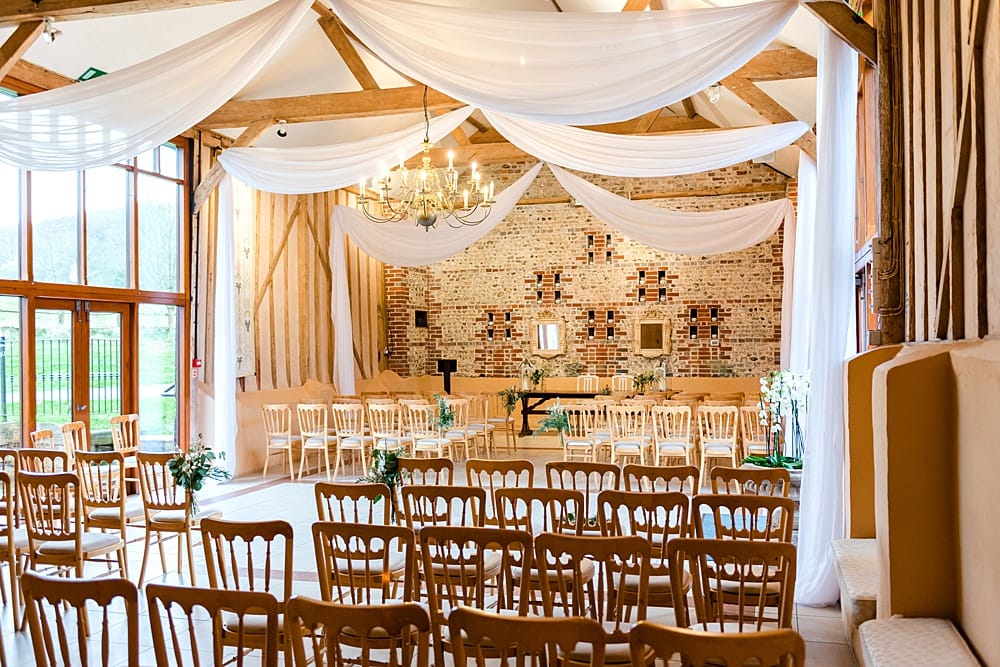 The light-filled East Barn has floor-to-ceiling windows with views of the South Downs to one side and the courtyard to the other. Its wooden beams and neutral colour tones are the ideal backdrop for saying ‘I do’.