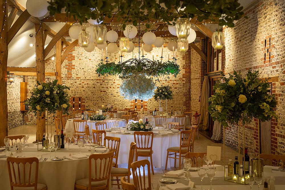 The spacious South Barn is the ideal setting for your reception. The wooden beams, flint stone walls and neutral colour scheme will complement any of your decorations perfectly. The barn has a warm and inviting atmosphere, whatever the season, with underfloor heating, candlelit wrought iron candelabras, seated dining for up to 150 guests and plenty of space for evening entertainment. The South Barn provides the perfect backdrop, from formal wedding breakfasts to informal barbeques.