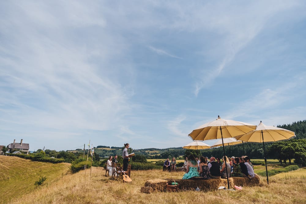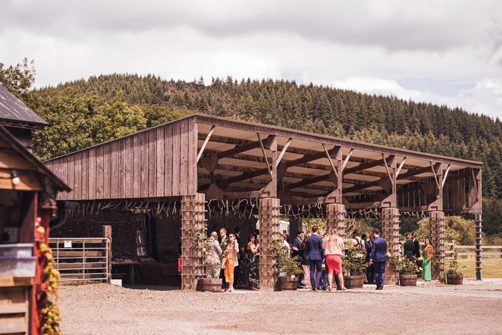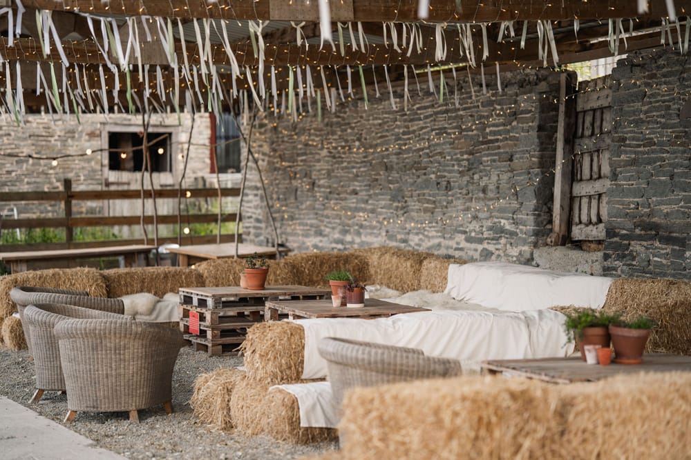 A huge open sided barn that can take up to 120 guests. With hay bale seating and a breathtaking view of the lodge and woodlands beyond.