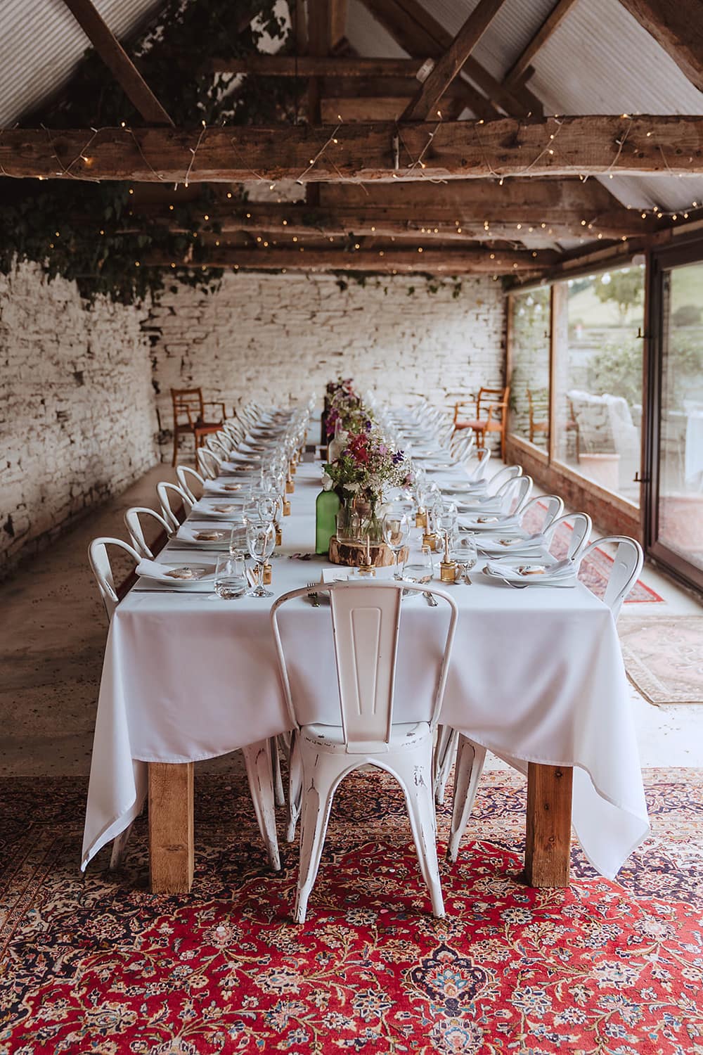 The Open Barn was the perfect place to host breakfast throughout the weekend, a sheltered spot on a sunny morning, transformed to a twinkling cosy corner for cake and cocktails at dusk. The Long Barn ceremony room by day, a club by night. Front lawn for Friday welcome drinks, post-ceremony canapés and Sunday evening BBQ. The Mound for our morning cup of tea, watching the swallows, and then for golden hour group photos later in the day. And the house for all the creature comforts throughout.