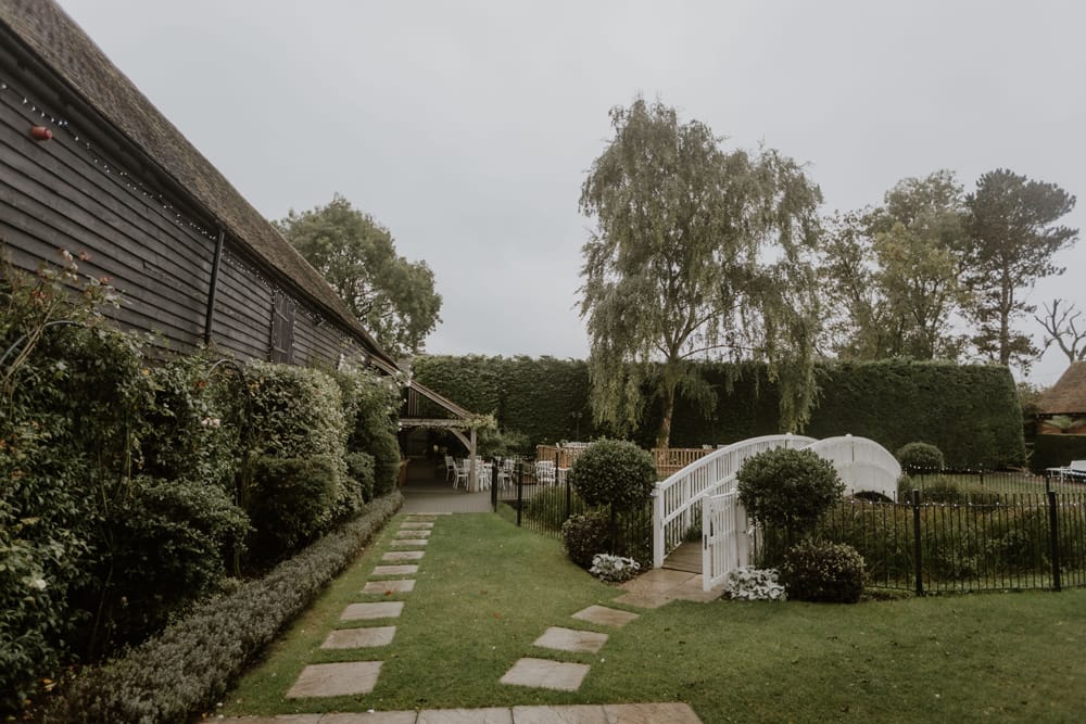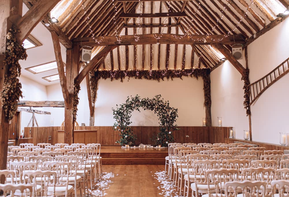 The venue offers a choice between an indoor or outdoor ceremony, each equally enchanting. The indoor Ceremony Barn, seating up to 150 guests, features original 16th-century beams, high ceilings, and oak flooring. Large windows flood the room with natural light, creating a magical atmosphere. Couples marry on stage beneath a canopy of fairy lights, surrounded by their loved ones. For those seeking an outdoor experience between April and October, the open-sided Cart Barn in the gardens provides a stunning space for a civil ceremony, with a paved walk leading through an oak arch. Seated on the lawns, up to 150 guests witness the exchange of vows, all under the charm of fairy light curtains.