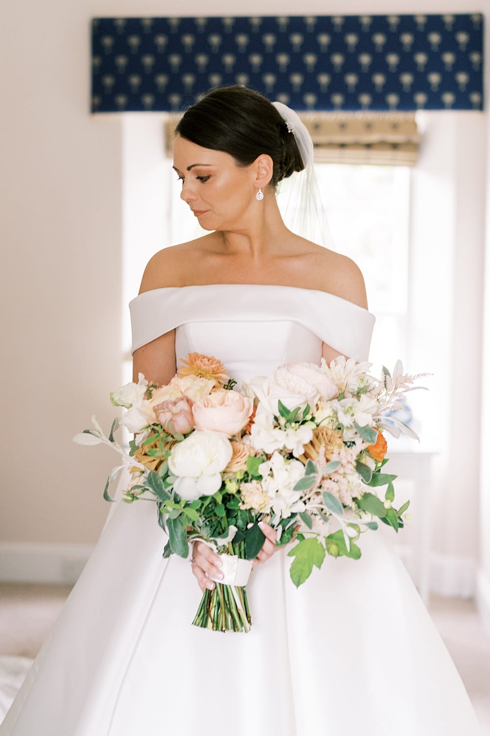My first experience of wedding dress shopping was perfect – the staff at Eleganza Sposa were outstanding. I had no idea what type of dress I was looking for but as soon as I tried on my Essence of Australia (D2716) off the shoulder dress, I knew it was the one. They matched my dress with a beautiful cathedral length veil and earrings to complete my look. My makeup was done by Claire at Spotlight Makeup with an additional artist, Emma Fairley. The bridal party’s hair was done by my friend and hairdresser Shona McDaid. Our beautiful bespoke wedding rings were designed and hand crafted by Blair and Sheridan Glasgow.