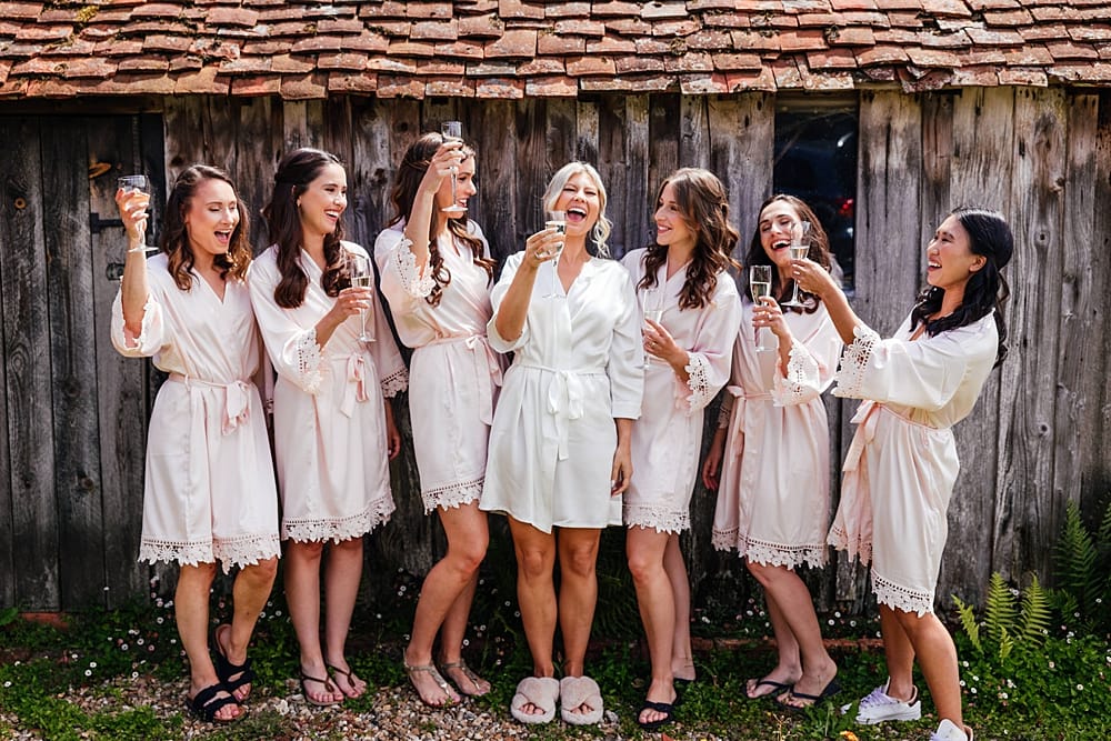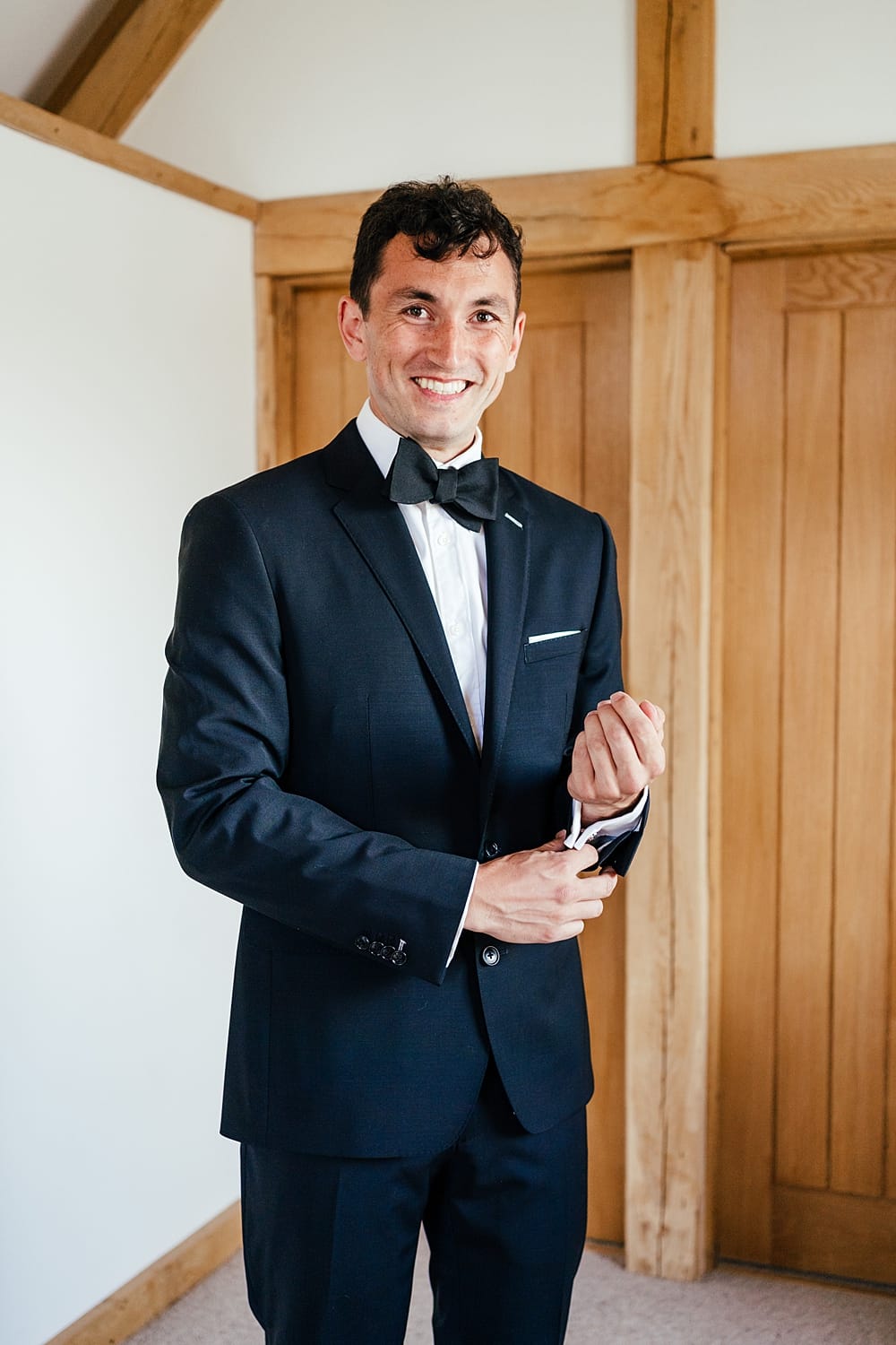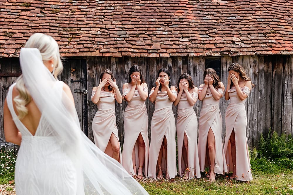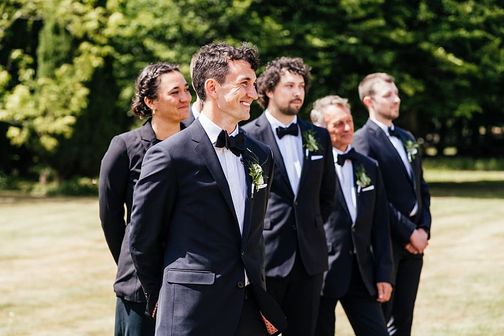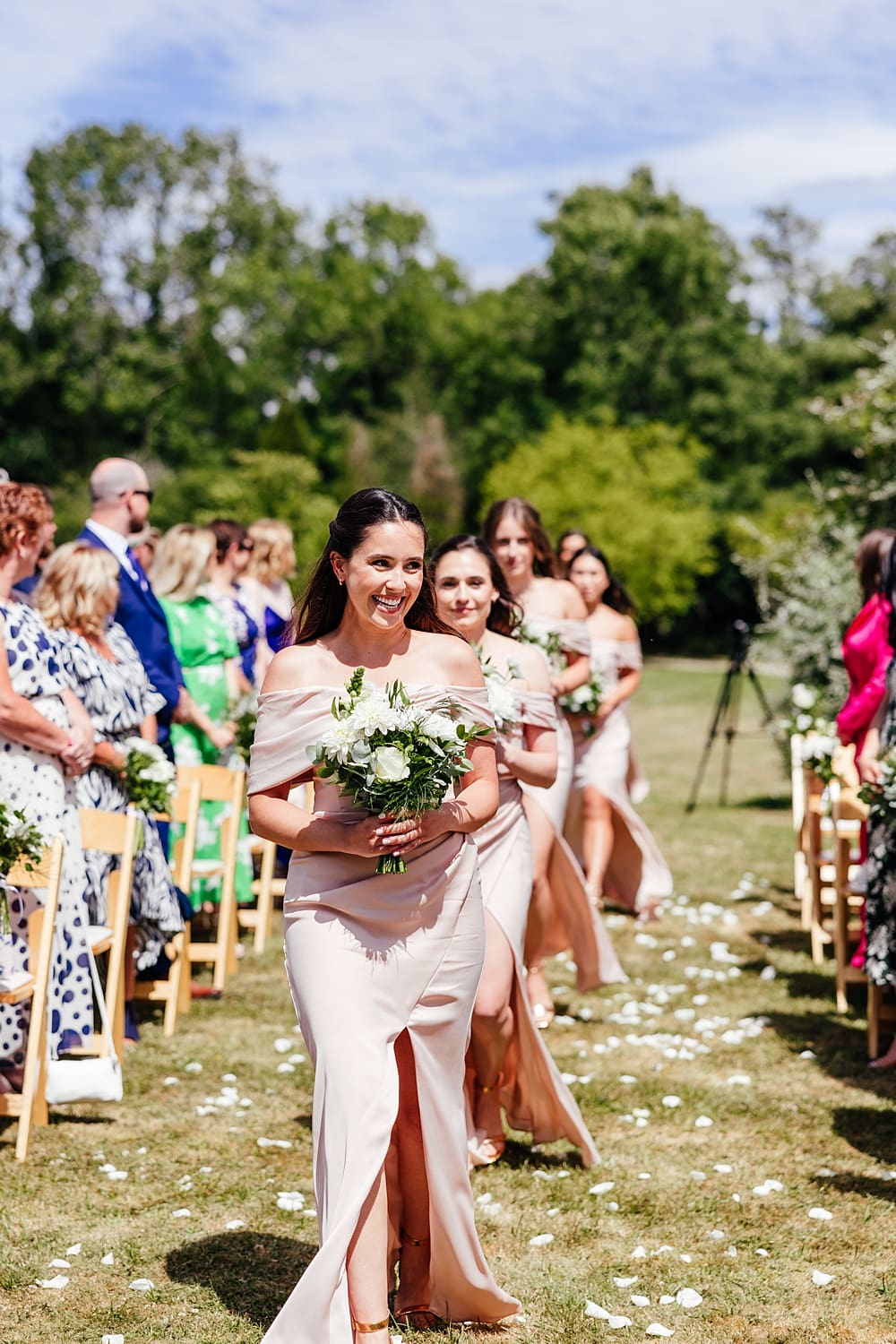 Ben and his groomsmen all wore a two-piece black suit from Moss Bros with black velvet bow tie and the six bridesmaids wore strapless dresses of blush pink, ruched at the hip with high leg split.