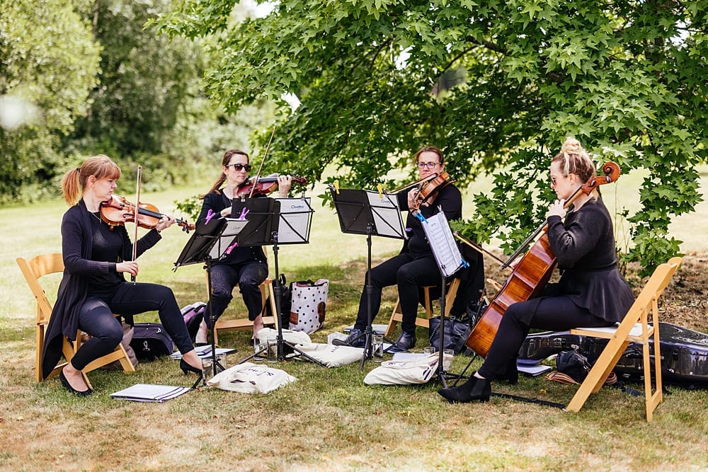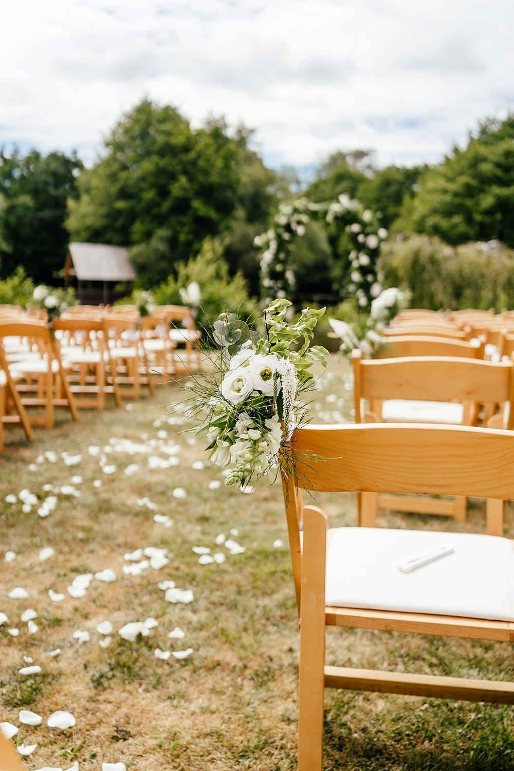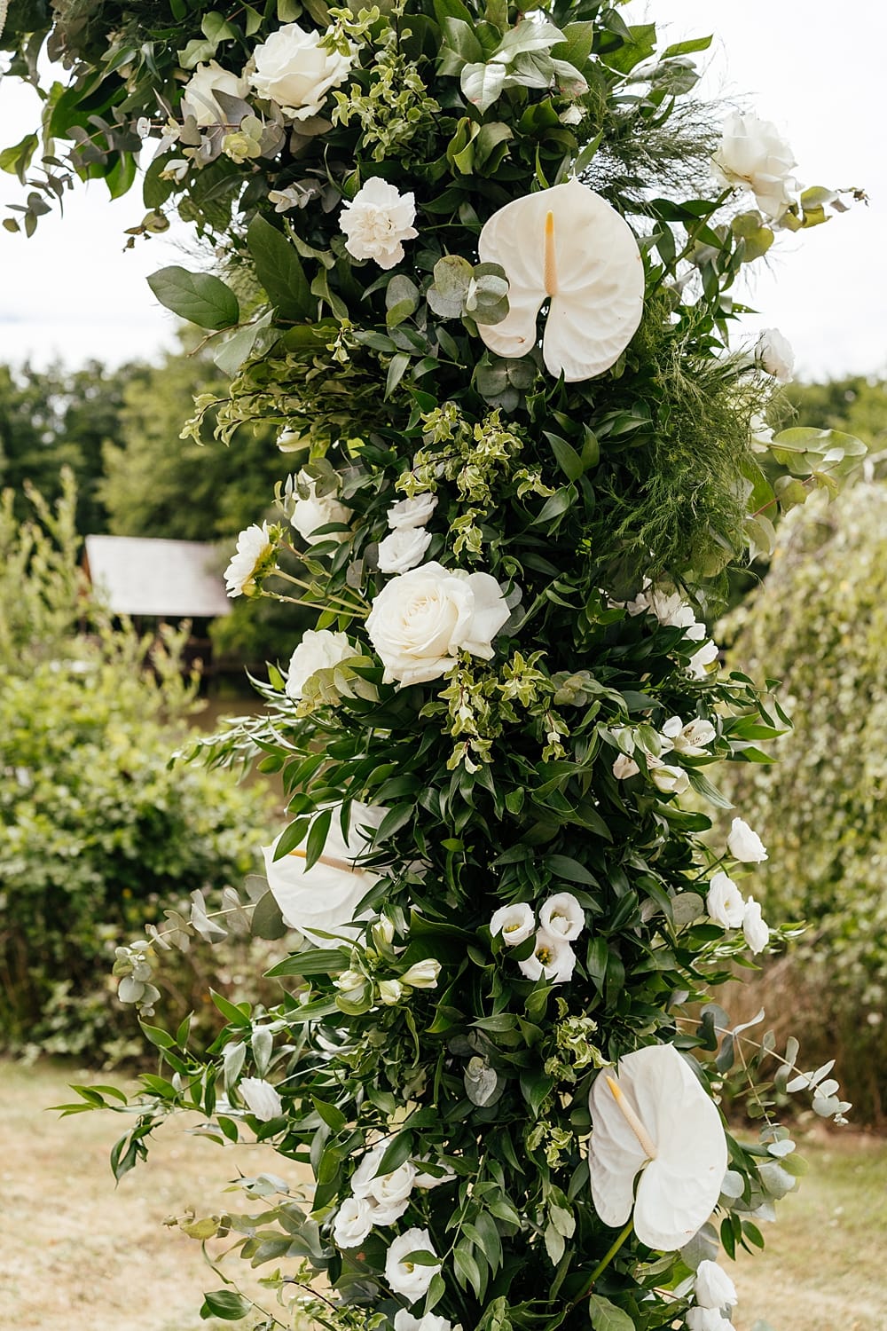 Abi and Ben had legally married on the Thursday at Leatherhead Registry Office. On their wedding day they held a wedding blessing ceremony overlooking one of the lakes at Spirit Lake. A string quartet played as guests arrived via the woodland path and white petals had been scattered along the aisle with small arrangements of flowers attached to chairs lining the aisle also. To finish the ceremony area a beautiful arch had been covered in foliage and large white roses, orchids and dahlias by Zuzanna of Bloomantic, this was the perfect focal point and backdrop to say their vows.