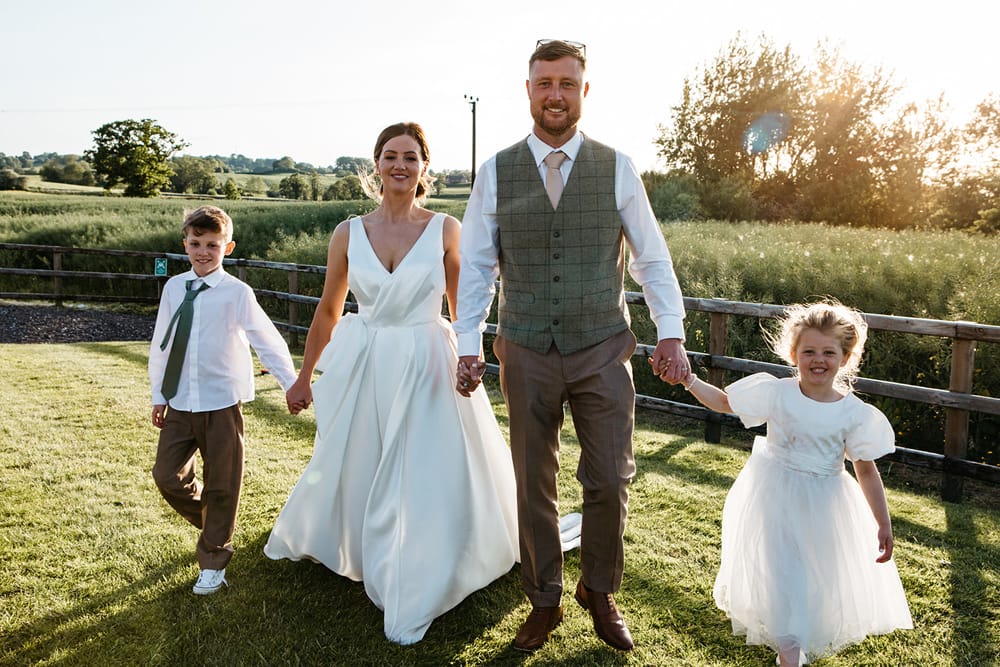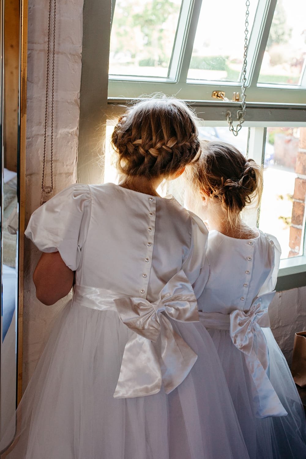 My dress was from Milla Nova at White Closet Bridal, Wallasey Village (now closed down), with alterations by Charlotte at The Sewing Room, West Kirby, and shoes from Be Mine. The bridesmaid dress was from ASOS, and the flower girls wore Angel & Rocket dresses with Lipsy high-top trainers. Keira Louise from KLMA Academy did all the hair and makeup.
