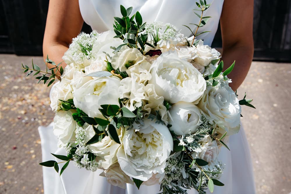 We chose different flower varieties, including scented white peonies, stocks, and sweetpeas. We added white Mondial roses, Buttercup roses, my favourite green viburnum, and lush foliage.