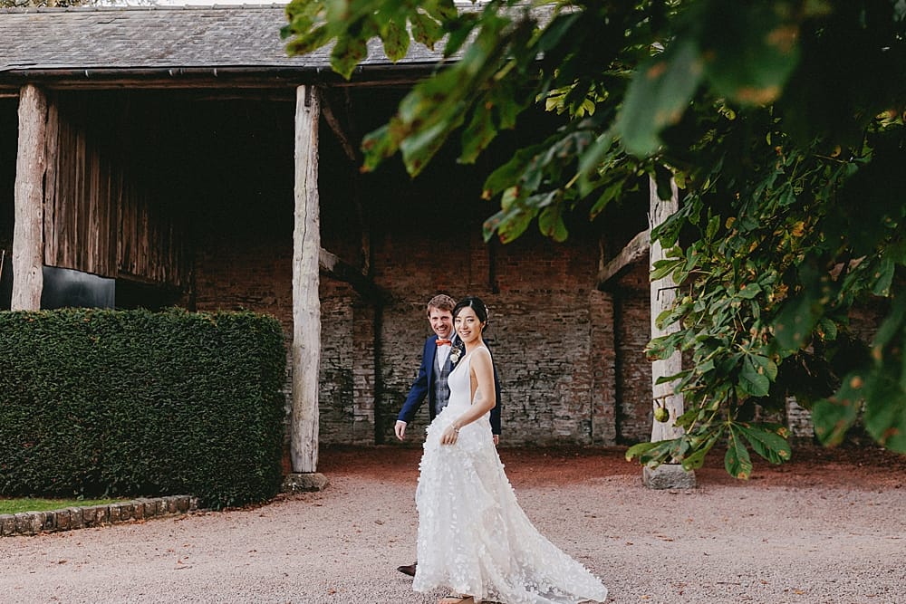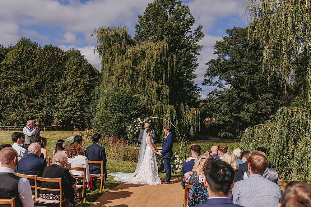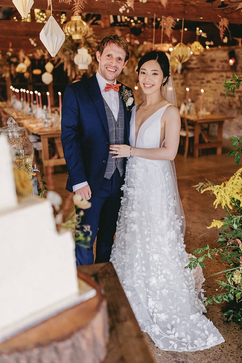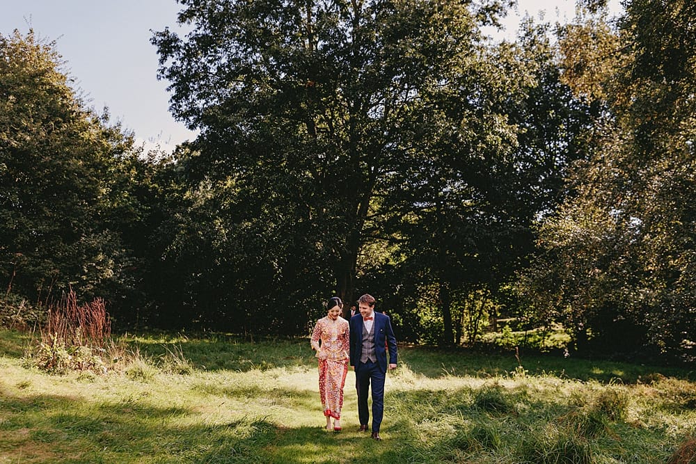 Clementine Moon was our chosen florist. The ceremony took place outdoors by the lake and the wedding breakfast at the Wainhouse Barn. Our vision was to have some large foliage/ floral installations suspended in the Barn. As for the ceremony space, we wanted a moon gate to represent our union of bringing two families together. As our wedding landed on the day of the Mid-autumn festival, a time when Chinese families come together under a full moon and dine together, the moon gate just seems the most perfect backdrop for our marriage.