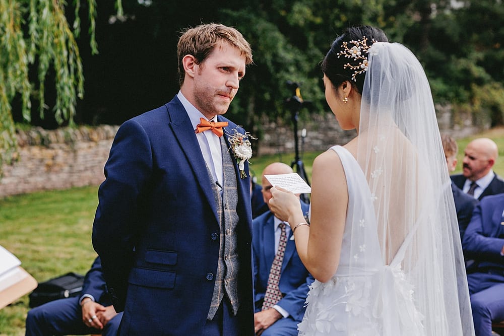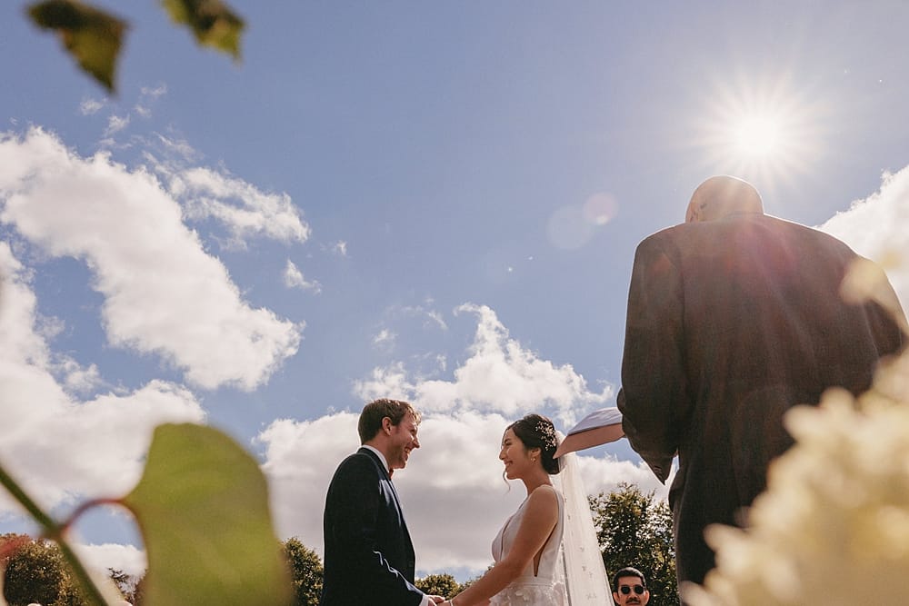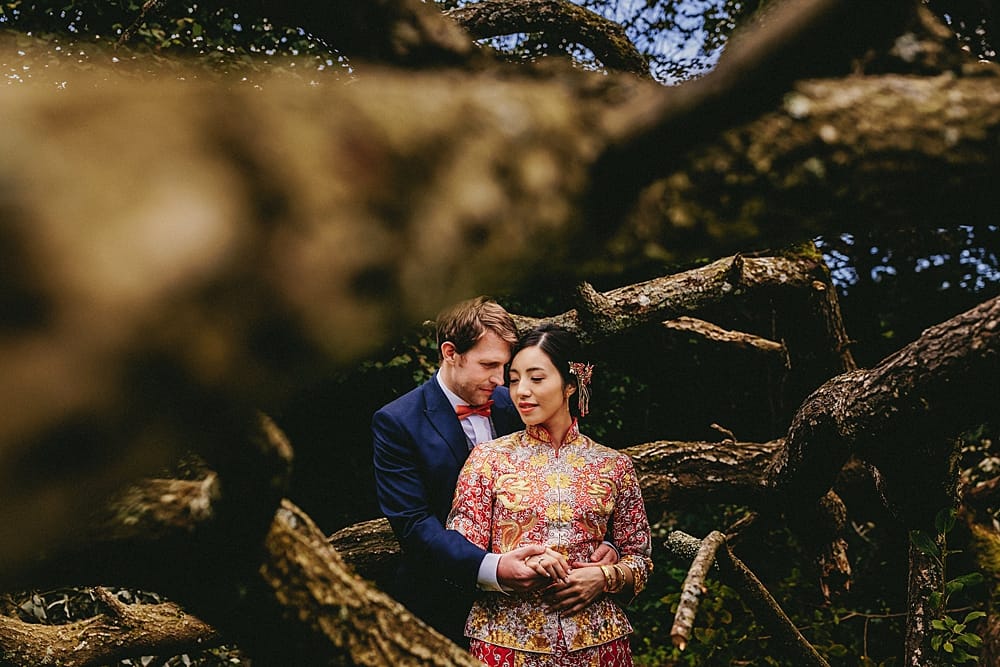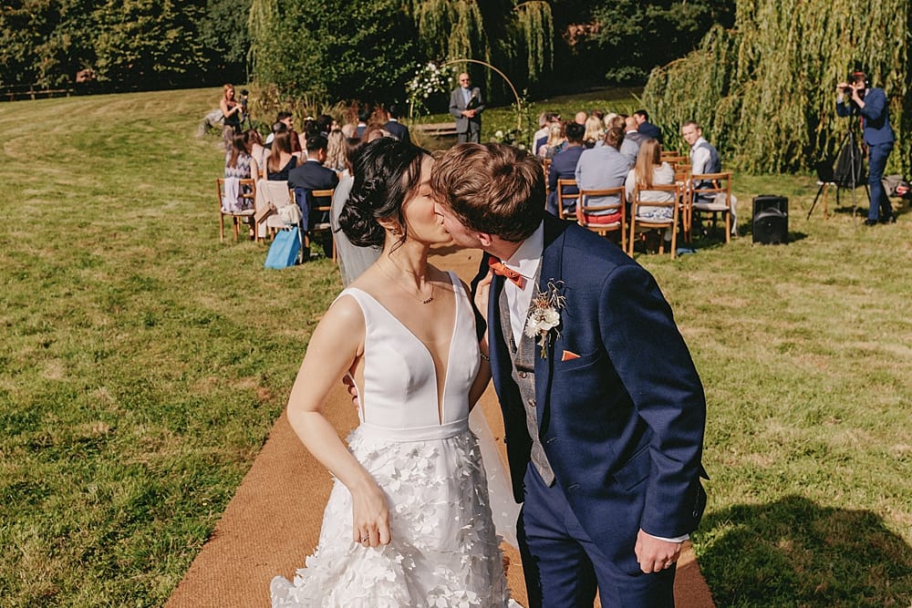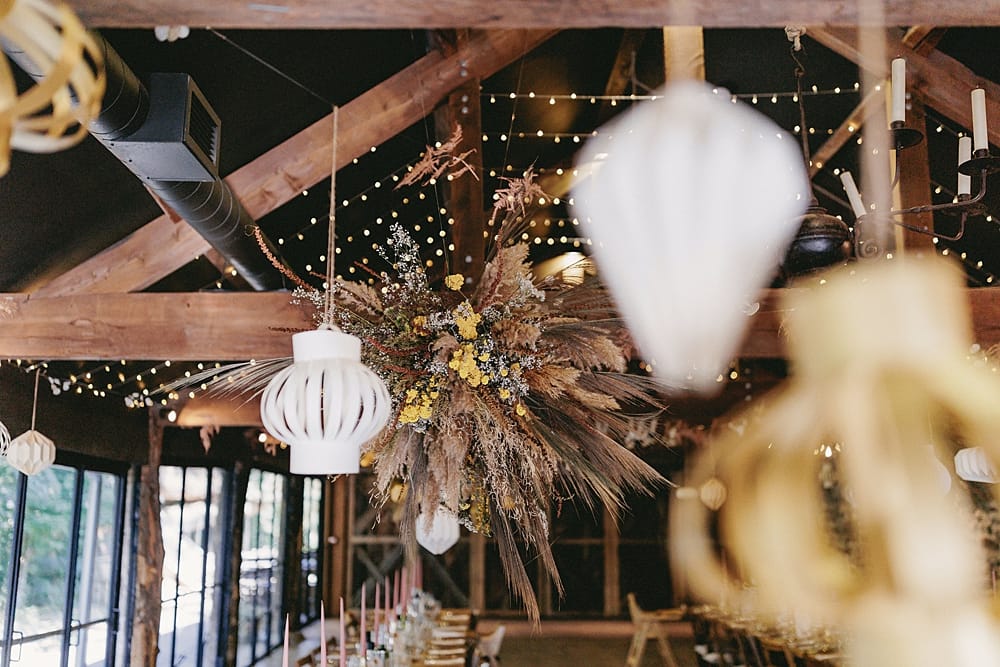Clementine Moon was our chosen florist. The ceremony took place outdoors by the lake and the wedding breakfast at the Wainhouse Barn. Our vision was to have some large foliage/ floral installations suspended in the Barn. As for the ceremony space, we wanted a moon gate to represent our union of bringing two families together. As our wedding landed on the day of the Mid-autumn festival, a time when Chinese families come together under a full moon and dine together, the moon gate just seems the most perfect backdrop for our marriage.