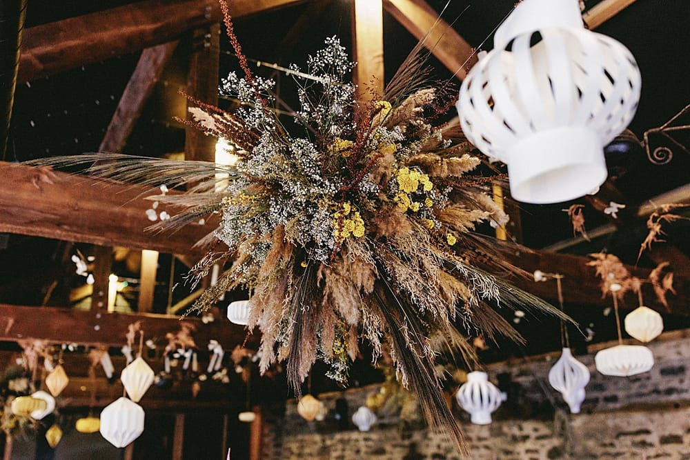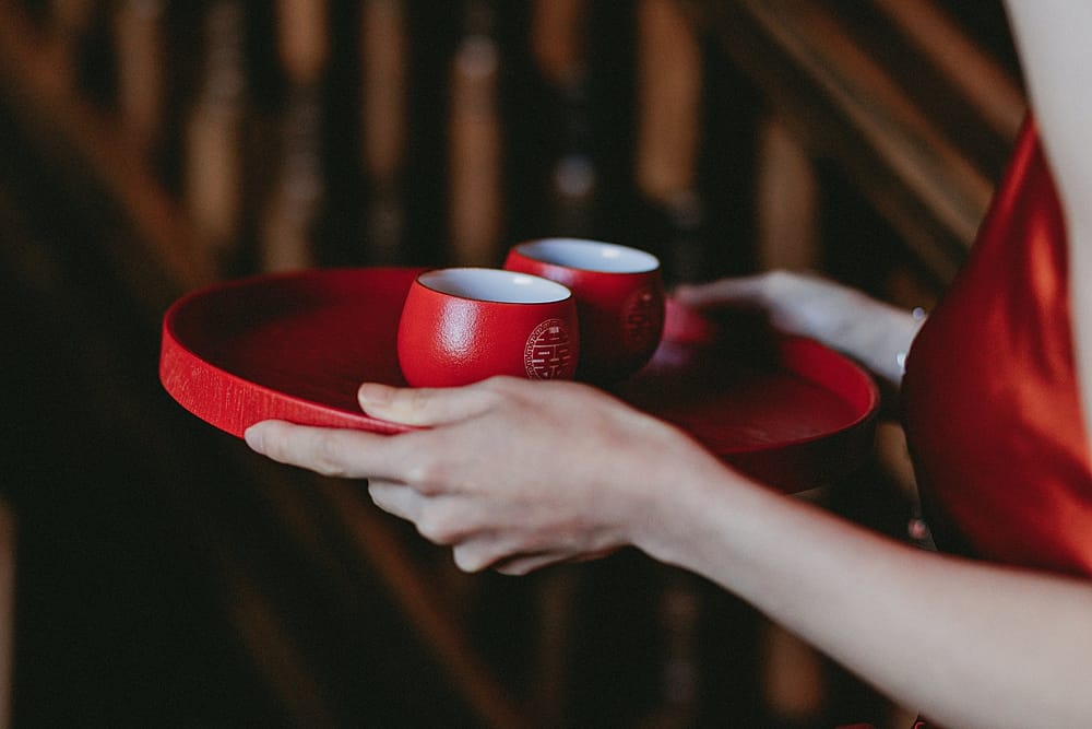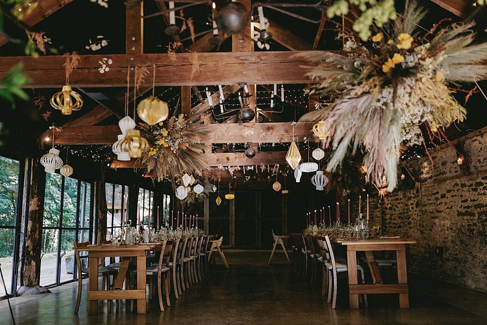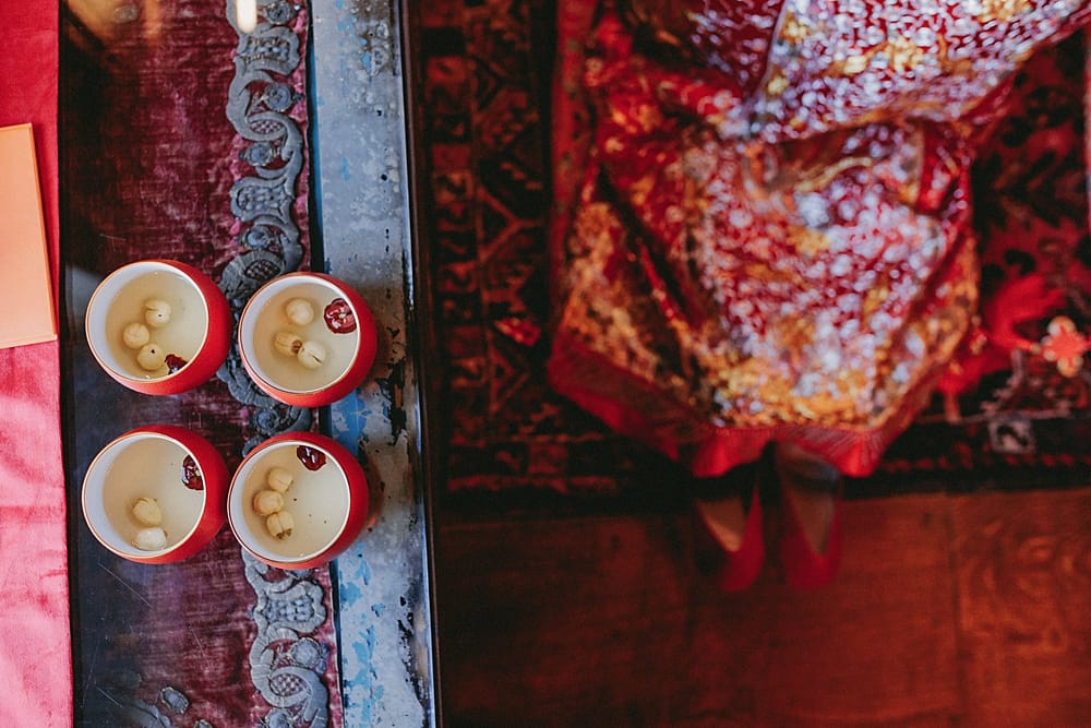 The theme of our wedding was: rustic with elegance and sophistication, mixed in with Chinese paper lantern elements as the bride is Chinese, and the groom is British so it was a cross-cultural wedding, which we wanted to reflect in the theme of the decor & floristry. For the main house and the living space where the Chinese tea ceremony took place, the colour scheme was mainly red and golden yellow to match with the Chinese cultural elements/ decor and the bride’s traditional red outfit.