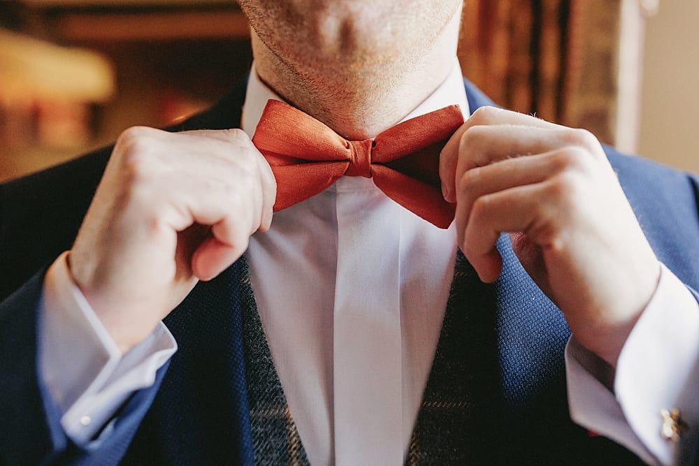 Our colour scheme was white with a pop of yellow, together with autumnal tones for the decor. We wanted to ensure that this was coherent and ran across the wedding party’s outfits as well. So for the bridesmaid, groom and groomsmen, the featured colour was burnt orange, paired nicely with a dark blue suit. The bridesmaid wore a long ankle length burnt orange silk dress. The groom wore a burnt orange bow-tie (as opposed to the standard tie for groomsmen) with a navy blue suit and a checked grey waistcoat.