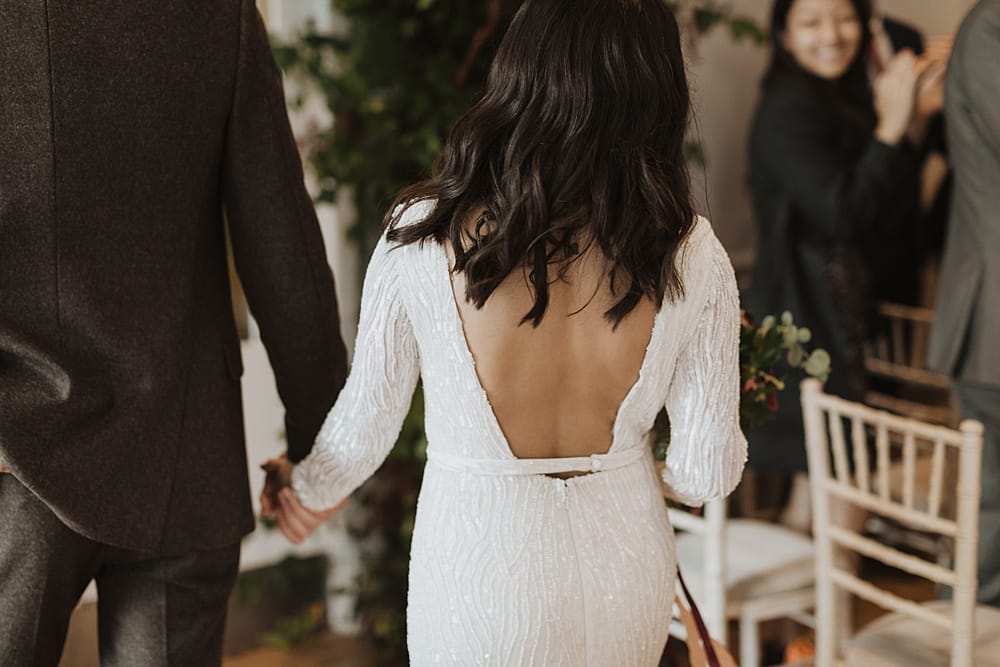 My Dress was Margareta by Karen Willis Holmes – completely covered in beading and weighing 4kg… it felt very old Hollywood glamour! Andy wore a custom tailored Yorkshire tweed suit from Edit Suits – staying true to his Yorkshire roots.