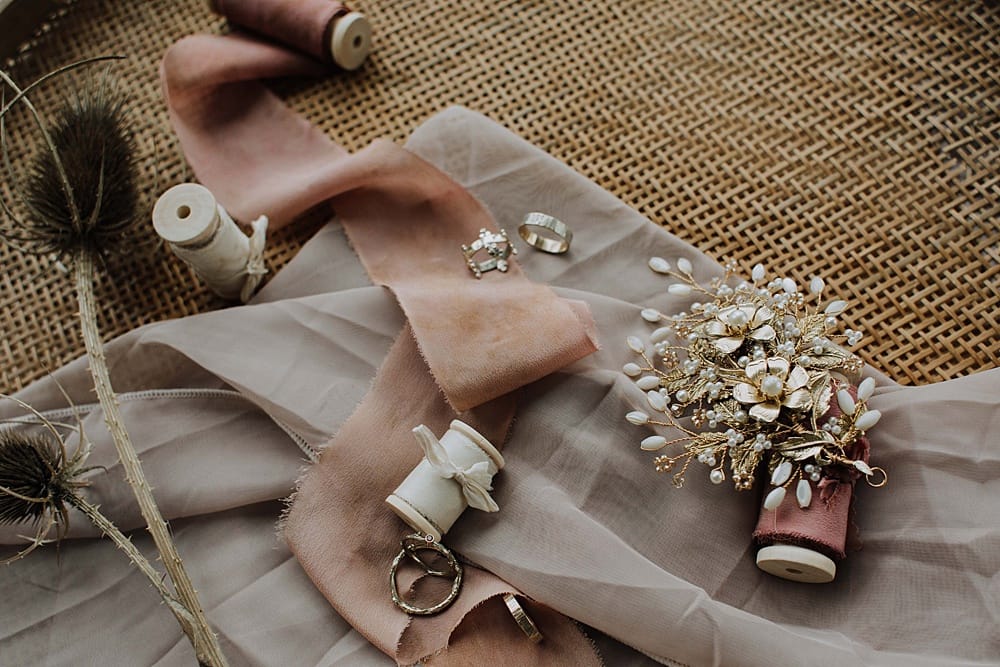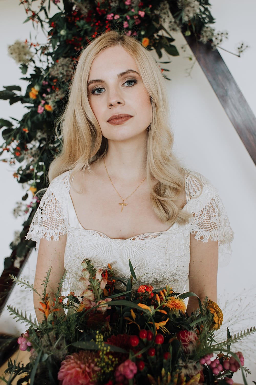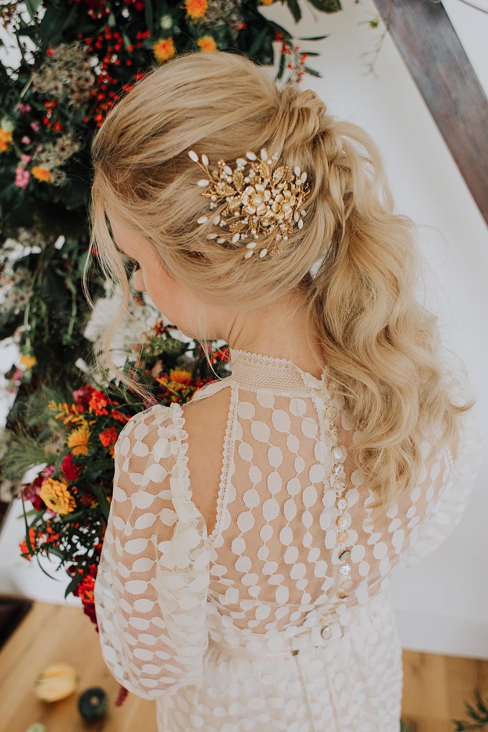We had three looks for our bride including a very simple, natural look with the Daisy dress through to the stunning Adrienne dress, which was accompanied by an incredible commissioned crown. Sarah Treble was a perfect choice for dress designer as she houses her couture collection of wedding gowns in her Exeter studio, and The Lucky Sixpence foraged for acorns and wheat sheaves to create our autumn halo crown. Yumé Jewellery, based on the edges of Dartmoor, has fabulous non traditional jewellery that I have wanted to showcase for a while. Our hair and makeup dream team of Laura le Page and Bridal Hair by Roseanne, created contemporary but romantic looks for our bride, with an autumnal pop of lip colour.