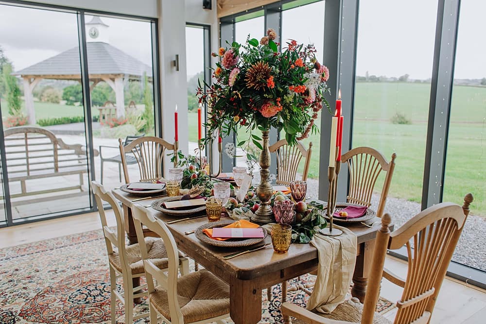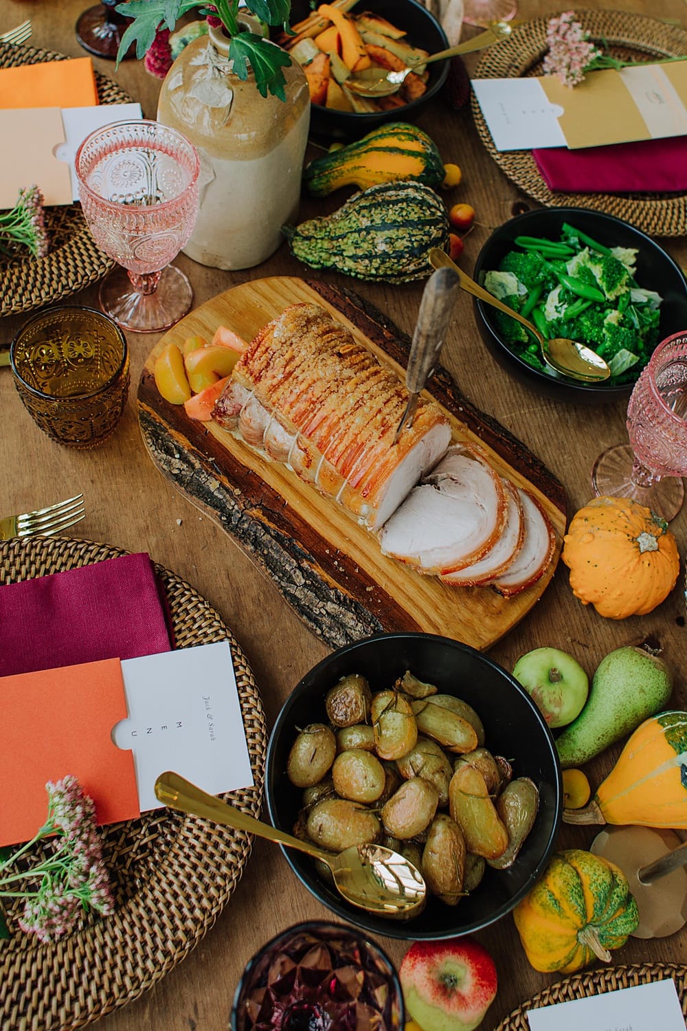 Isn’t that the truth, and the perfect brief for this colourful, seasonal editorial which took place at Harefield Barn and their bountiful orchards. I am partial to a smattering of seasonal fruit and vegetables nestled amongst wedding florals so I was delighted to spot apples, pears and pretty squashes adorning the tables here, as well that exceptional looking roast dinner!