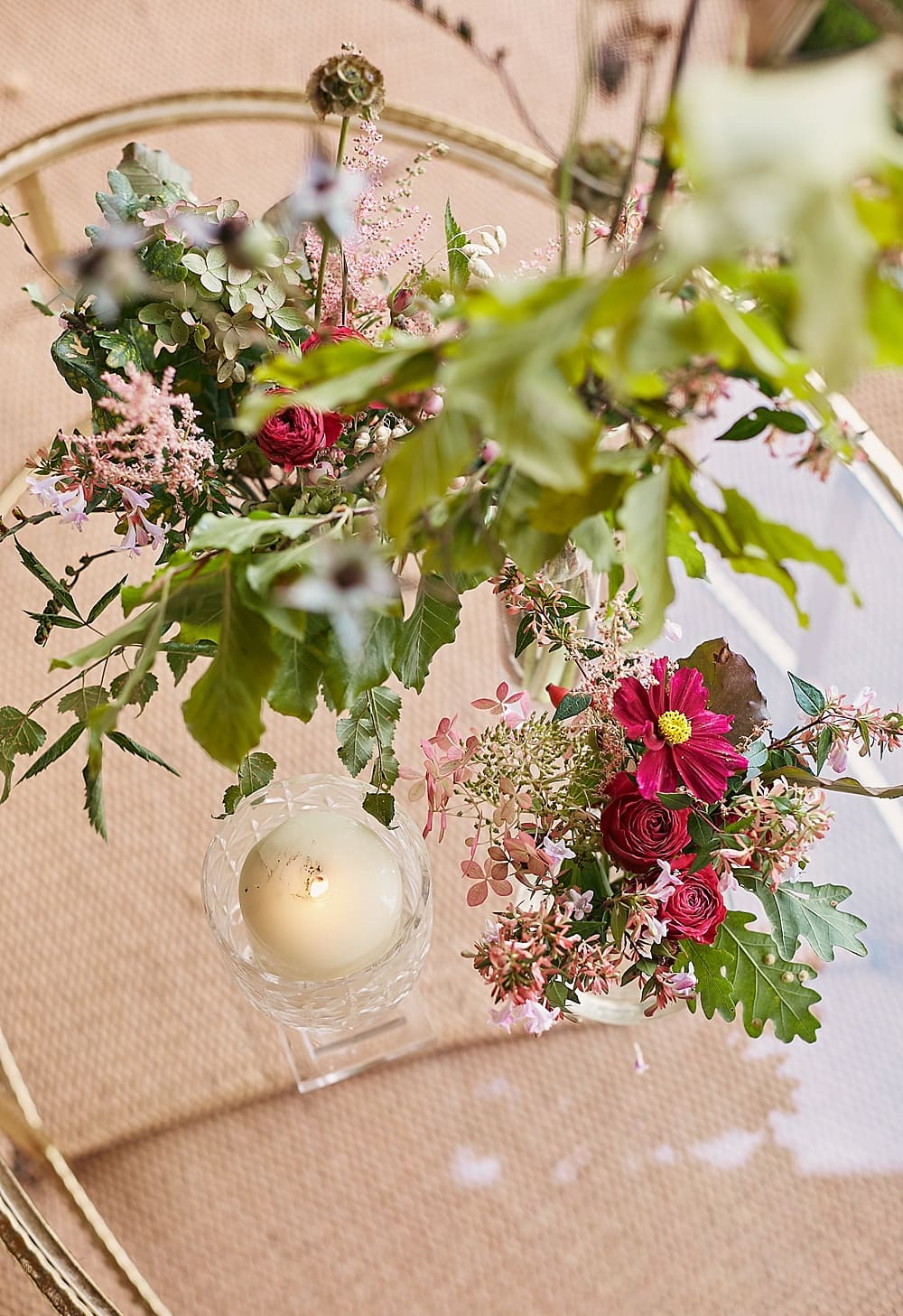 The entire concept illustrated that a small intimate wedding (within pandemic restrictions) did not have to be lacklustre in any way. Showing how couples can work on creating impact overhead not just from hanging installations, lots of warmth from candlelight and a cohesive design to create that intimate setting for their wedding breakfast.