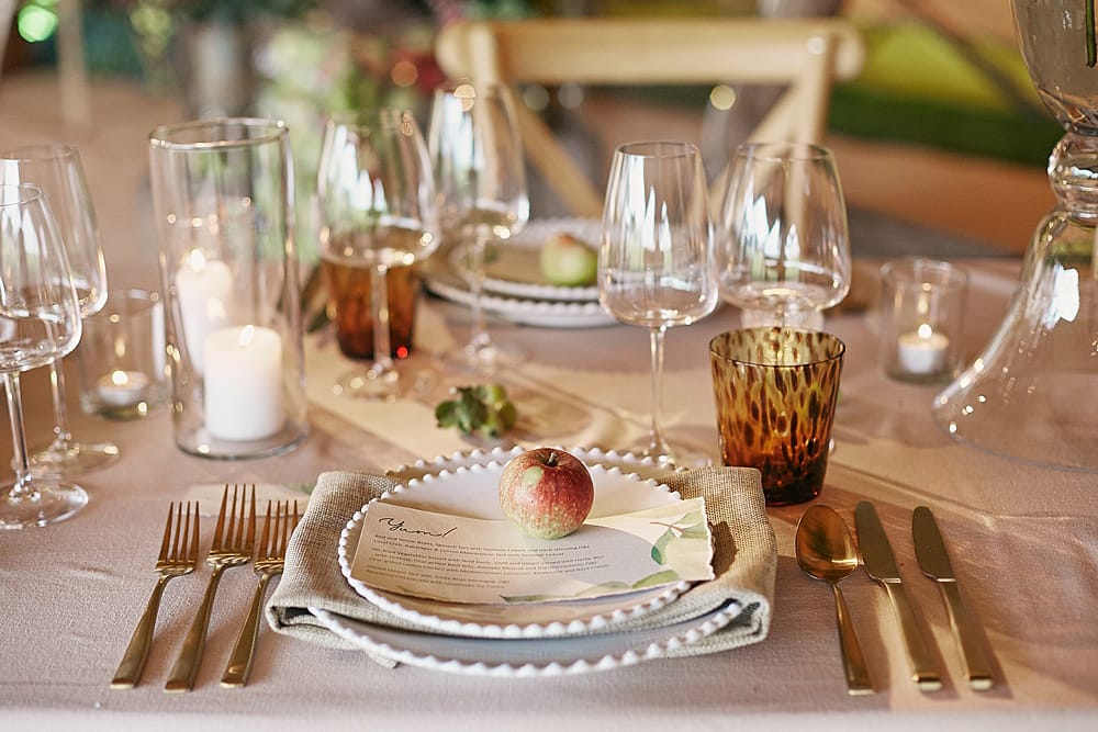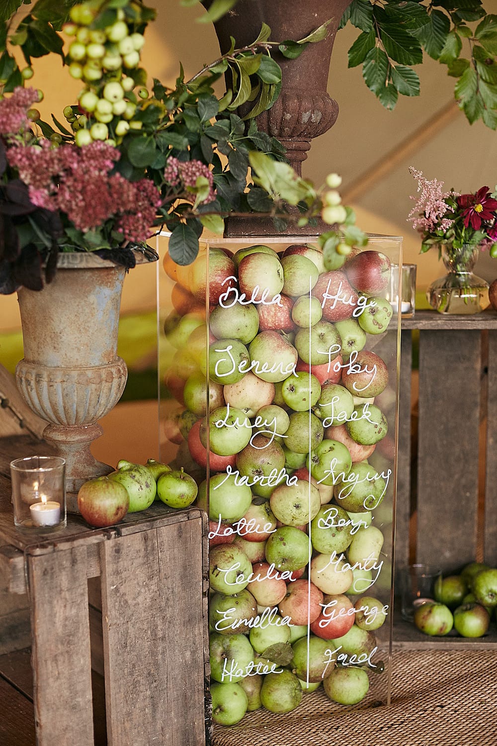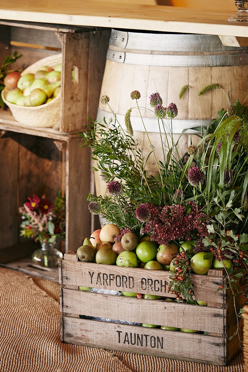 Emma, the florist, used seasonal foliage like Cotinus, Beech and branching crab apples. As well as rich burgundies to lift the hues out of the fruit itself, she used Chrysanthemum blooms, grasses, seed heads and sedum in cut glass vases on the occasional tables, the bar and through large arrangements in apple crates framing the table plan. Bountiful crab apples and small windfall apples were used across the table, on place settings, scattered between glasses and in the perspex columns as a table plan.