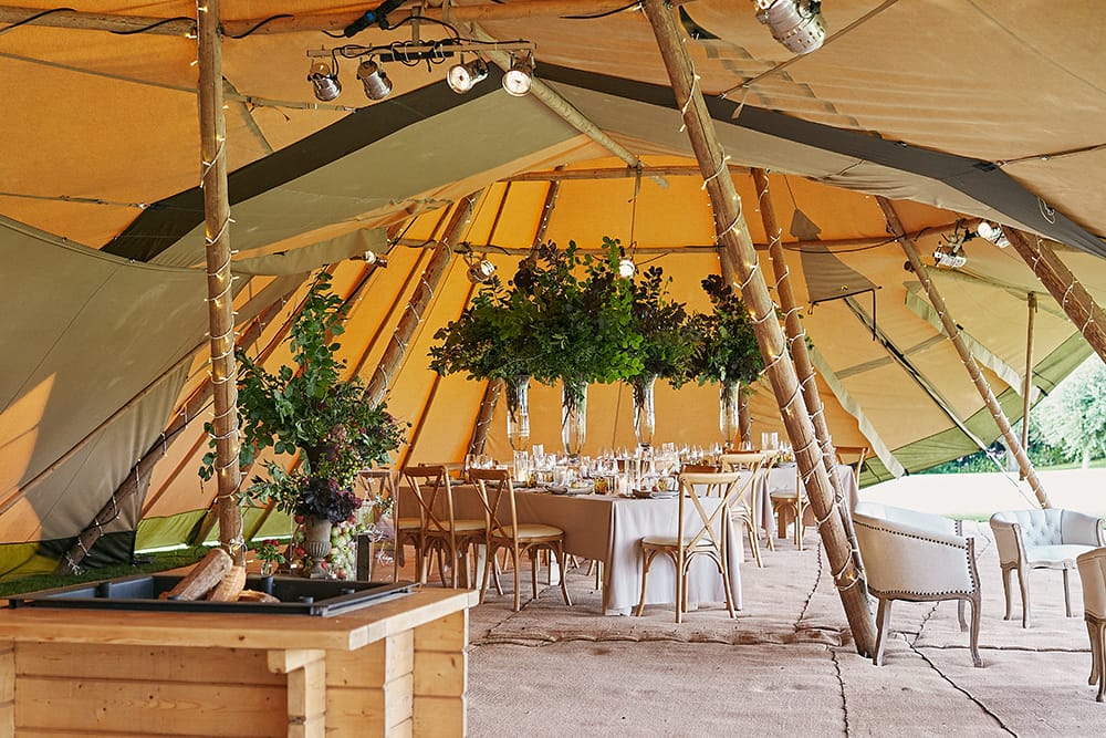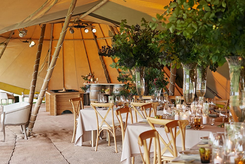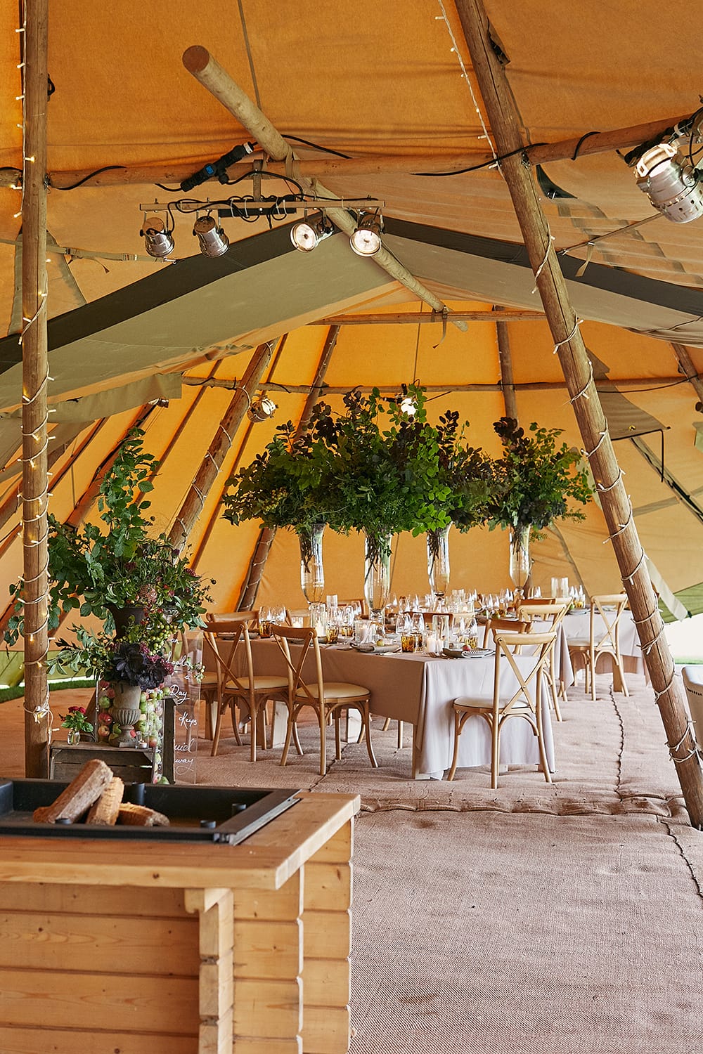 The design team of Rosie Barrett and florist Emma Whicher of Martha and the Meadow worked together to elevate and illustrate a feeling of seasonal abundance but in an elaborate rustic design concept. Tipis, naturally lend themselves to bold use of foliage, it seems that many other colours and textures can sometimes get lost within their lofty canvas spaces. So with previous experience decorating such tents, we knew what aesthetically works and what does not.