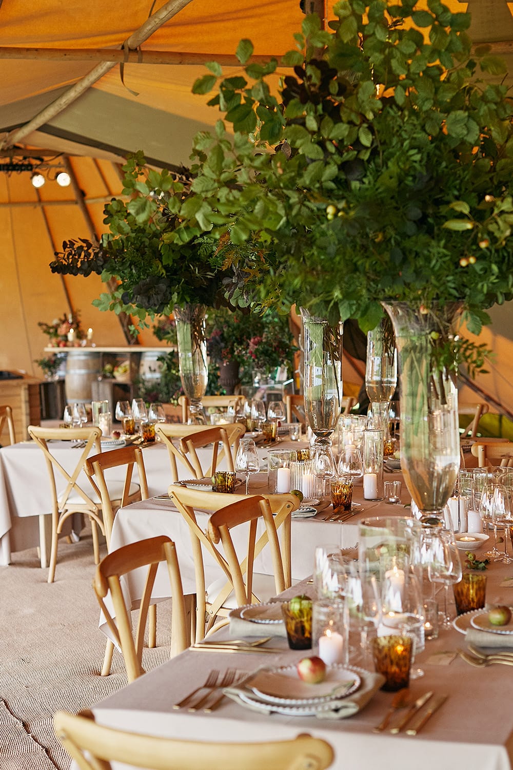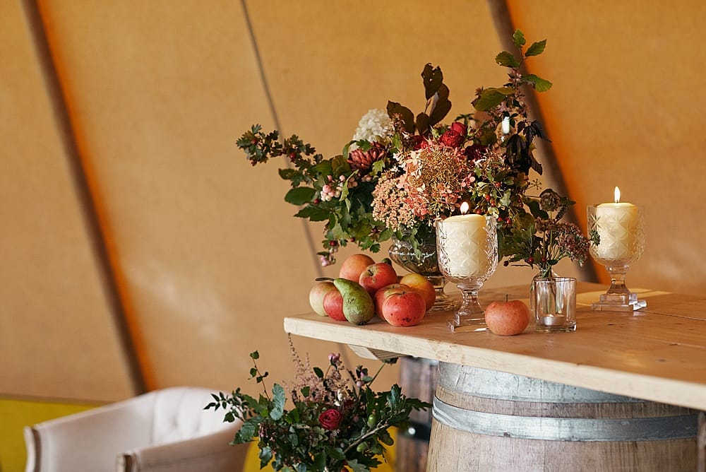 It was September so we embraced apple season, working with taupe linens to sit alongside the Canvas of the tipis, lots of green foliage with touches of burgundy to pull the colour out of the pinks in the apples.