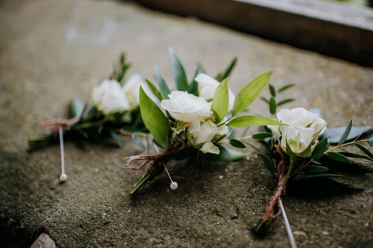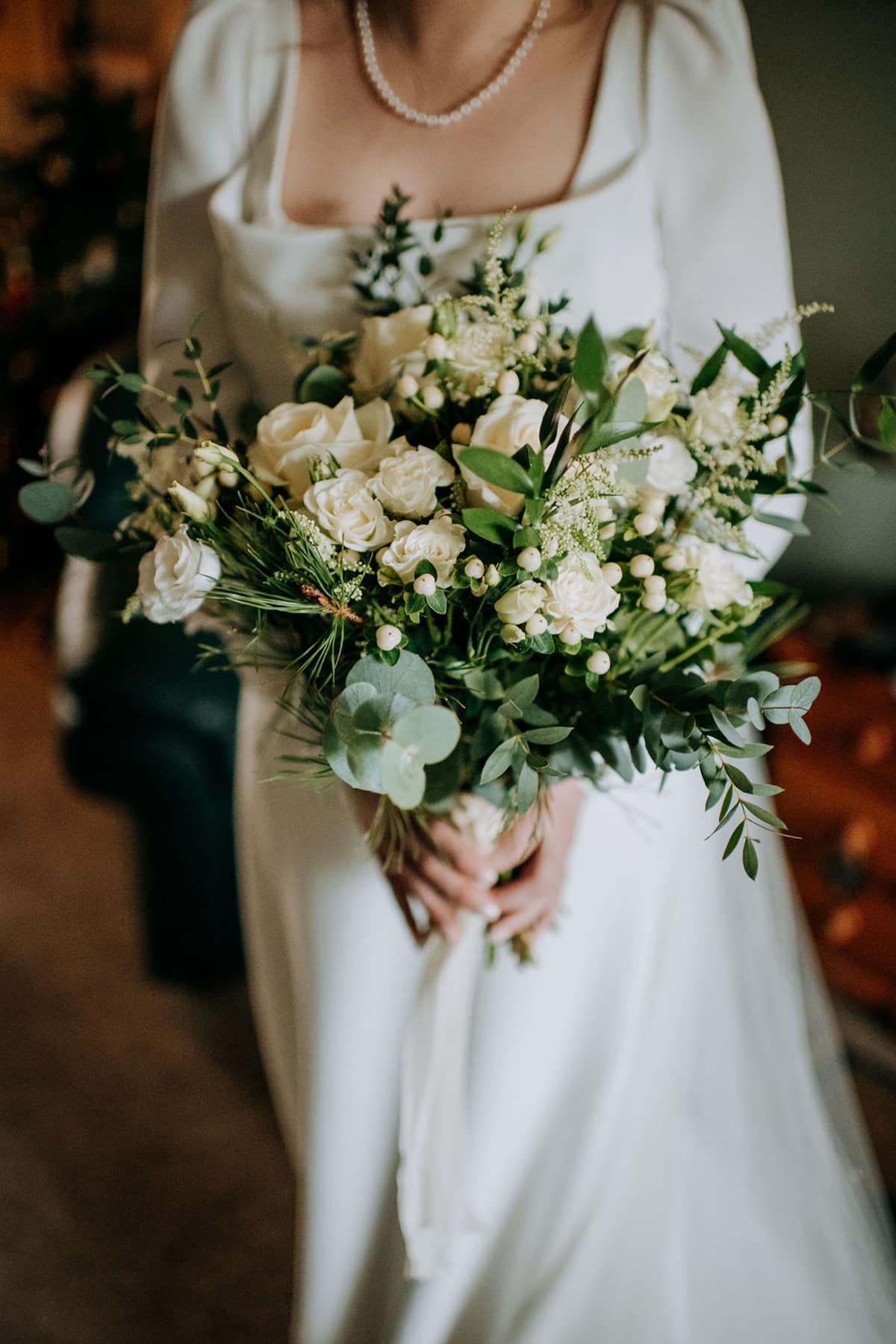Petal & Stalk created our florals, and they put together an incredible installation for the ceremony. It later served as the backdrop for the top table during the wedding breakfast. Suspended centrally as a cloud, it hung above us at the top of the aisle. Using mostly greenery and natural branches, the display was full of texture and avoided feeling too structured. To tie in Christmas, we wove warm fairy lights through it and added a beautiful red velvet bow. My bouquet and the buttonholes matched perfectly. They featured lush greenery and pure white blooms for a fresh, elegant look.