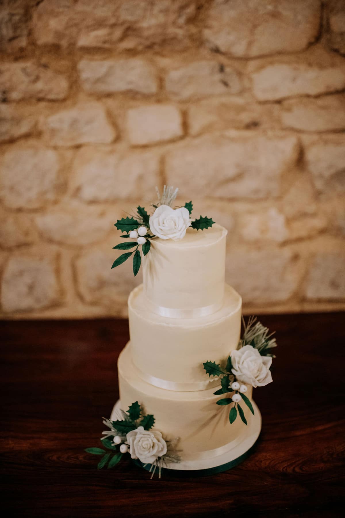 Our wedding cake was a beautiful three-tier creation by The Cake Queen Lincoln. Decorated with white fondant icing, green foliage, and white blooms, it looked traditional and tasted amazing!