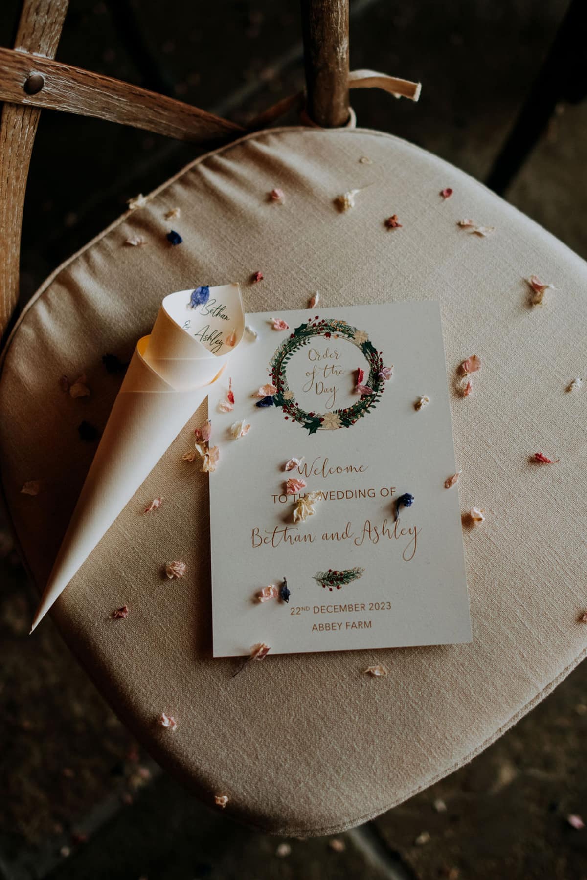 Abbey Farm’s ceremony barn brought all the charm and character to their winter celebration—oodles of greenery, twinkling lights, and just the right amount of festive nods (without tipping into “themed wedding” territory). Described by Bethan as “everything just felt right,” this gorgeous day had it all: the freedom to design a celebration that was completely their own, a team that was there when needed, and an evening that struck the perfect balance between lively, fun, and intimate. With their first anniversary just around the corner (congrats!), we’re excited to revisit this magical day and share all the stunning details.
