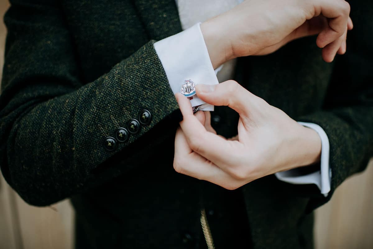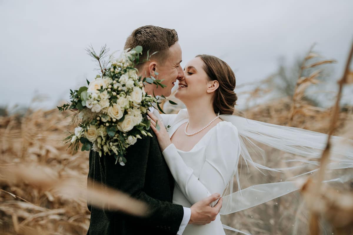 I found my beautiful wedding dress locally at Jayne’s Bridalwear in Lincoln. It was a design by Pronovias—perfect for a winter wedding—with elegant, effortless details like a square, subtle waterfall neckline and slight puff shoulders. The stunning bridesmaid dresses came from Coast, and their gorgeous green tones perfectly matched our colour scheme and the season. My makeup was done by the incredible Rachel Bray Makeup Artistry. She’s a perfectionist at creating the simple, no-makeup look I wanted. We sourced the suits locally from Gere in Lincoln, with designs by Marc Darcy.