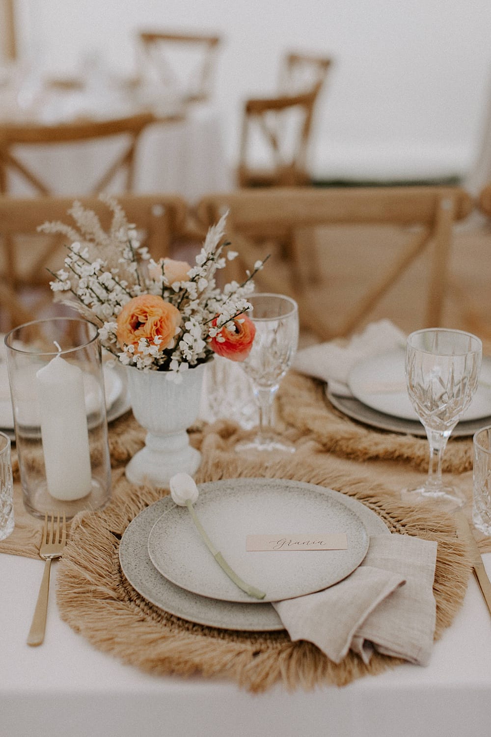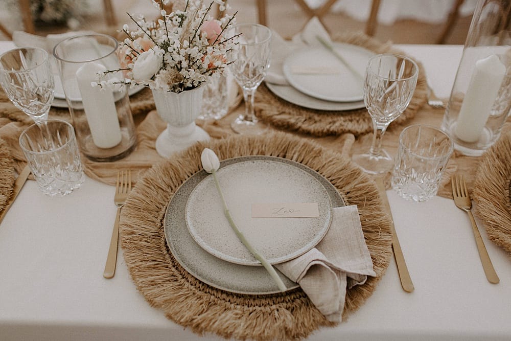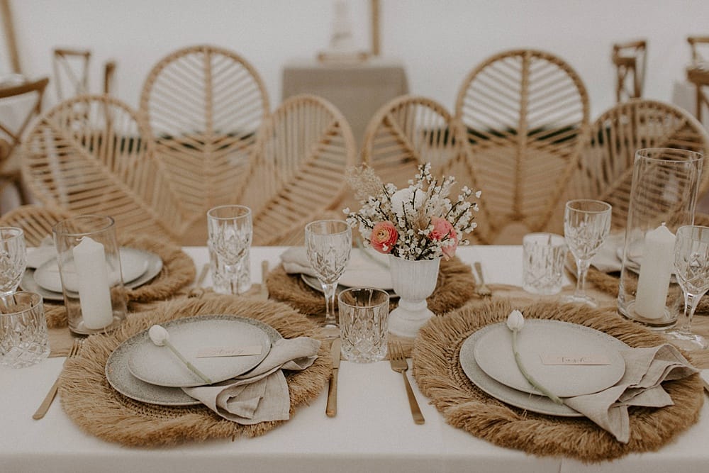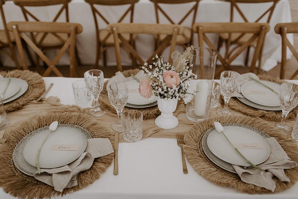 Cathy from Boelle Events wanted to create a bright but calming look in the Sailcloth, so we chose a colour palette of soft white tones and neutral textures with some pinks, and peaches added. Cathy has a signature Bohemian edge to her styling and we loved the fringed place mats, rattan statement petal chairs for the couple and wooden beaded chandelier.