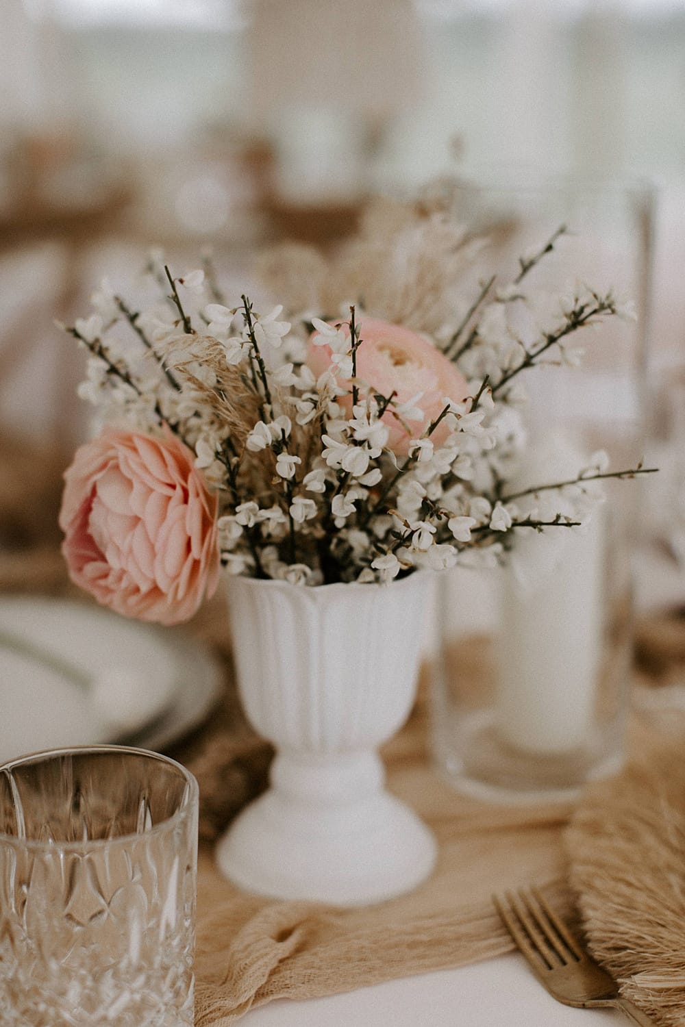 A big part of this styling was sustainability. Both Cathy and Maria from The Flower Patch are huge advocates for sustainability in their work and ensuring everything they use is sourced locally. Maria added her touch to the space with her gorgeous florals, with subtle pops of pinks and peaches as the centrepieces for the tables, combined with raised floral displays on the round tables.