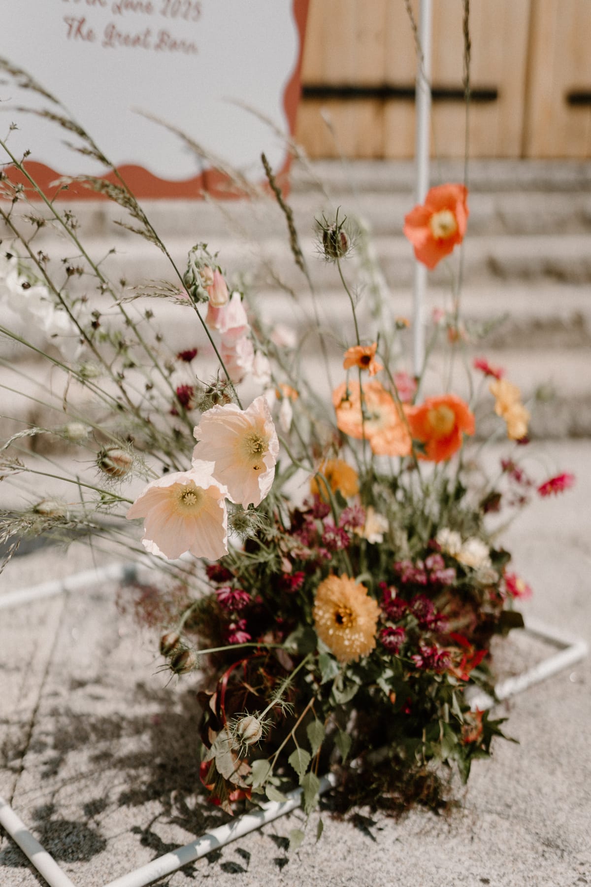 Our florist, whose hand-grown blooms are nurtured, picked, and arranged on their flower farm, is located less than a mile from The Great Barn Devon. This close connection to the land was an essential part of the shoot’s feel – one that was local, seasonal, and sustainable. Working with what was flourishing most beautifully at the time, the arrangements became a true celebration of summer abundance. From rambling roses to airy grasses and vibrant seasonal blooms, every stem felt fresh from the garden, enhancing the authenticity and romance of the Boho Luxe style.