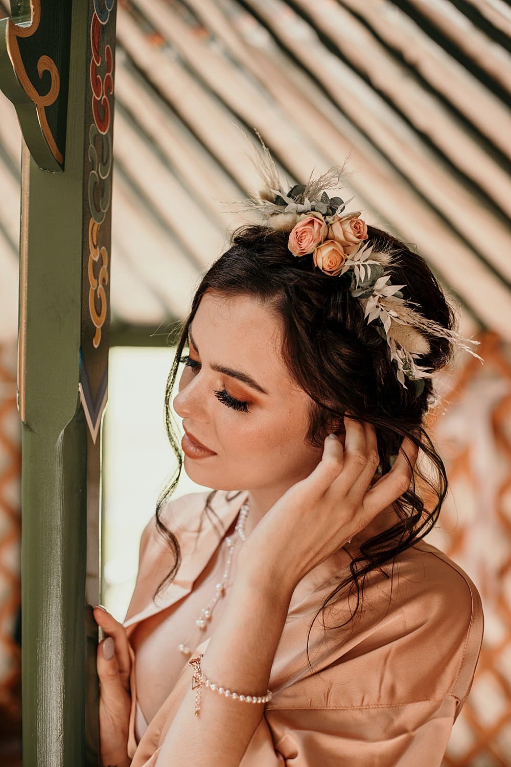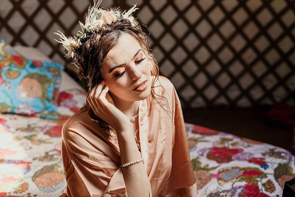 Jo, With Love and Lace, designed and handmade the bespoke bridal dress and bridesmaid dress for this shoot and Matchimony’s rose gold and dusky pink dressing gowns were modelled in the yurt. The skirt was simple and understated and the top of the bridal gown was made in a floral stretch lace with a deep-V and low back, accentuated with Sarah-Jane’s, Bish Bosh Becca, delicate pearl and rose gold lariat back drop necklace. This was paired with matching drop earrings, bracelets and a pearl choker.