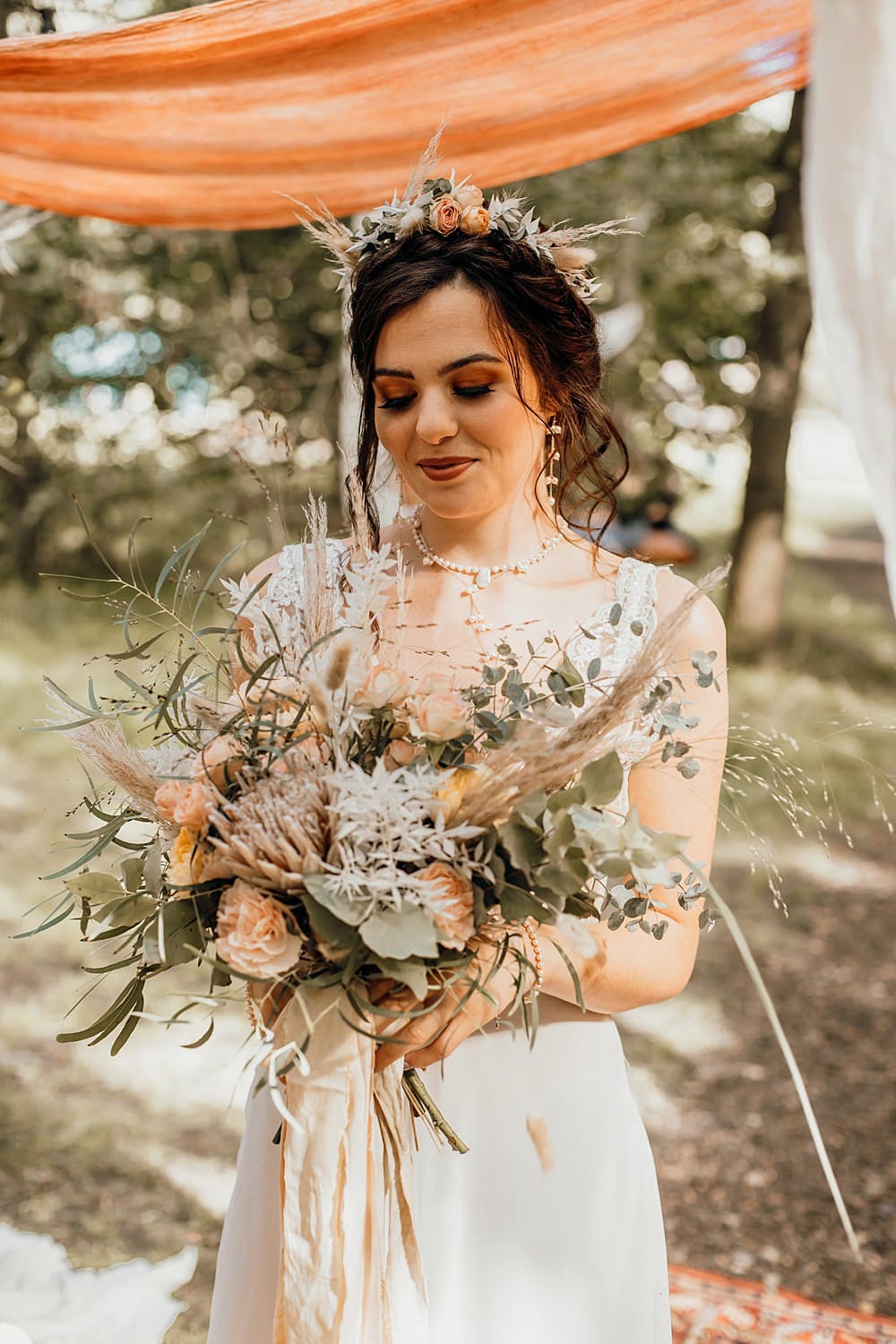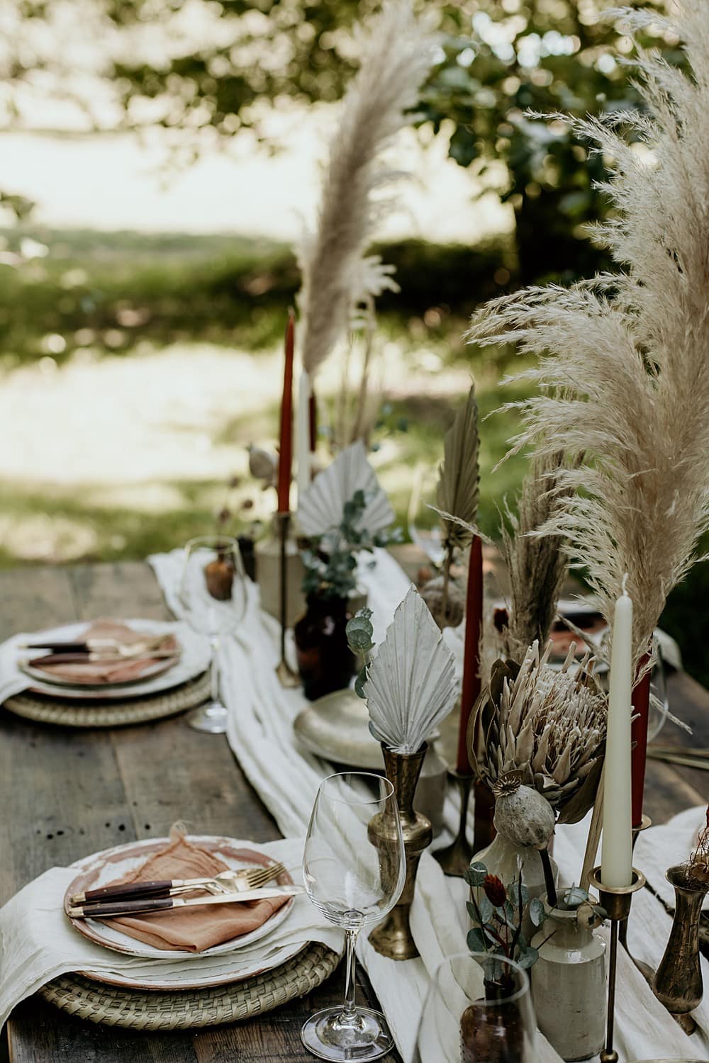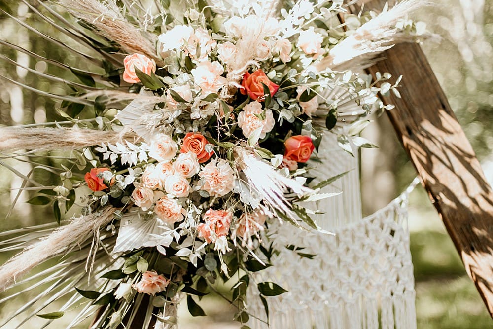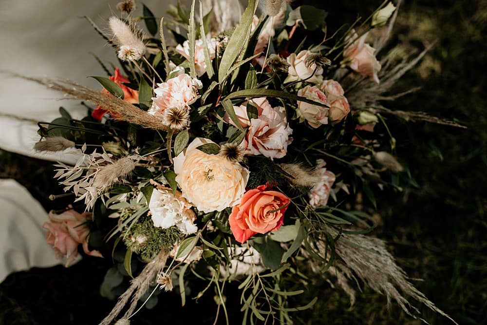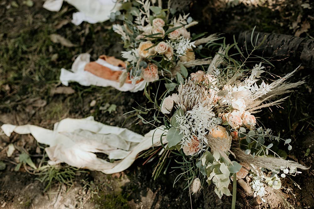 Our florist, Charmaine used an inspiring mixture of fresh and dried flowers and foliage to create a wonderfully textured bohemian effect. Fresh florals including ‘Golden Vuvuzela’ and ‘Miss Piggy’ roses, ‘Azore’ spray roses, peach carnations, apricot lisianthus and a mix of foliages including Soft Ruscus, Eucalyptus gunnii and Eucalyptus nicholii were used. These were accompanied by a wonderful array of dried materials including pampas grass, palms, palm spears, lagurus (or bunny tails as they are more lovingly known), bleached ruscus, protea, poppy seed heads and nigella seed heads. Charmaine’s unstructured bouquets were paired with Mia’s ethically hand dyed trailing ribbons and this combination added to the boho rustic, wild and free feel of the shoot. A large installation accented Amy’s reclaimed wooden triangle arch used for the ceremony backdrop and single stems in bud vases were scattered across the dining table.