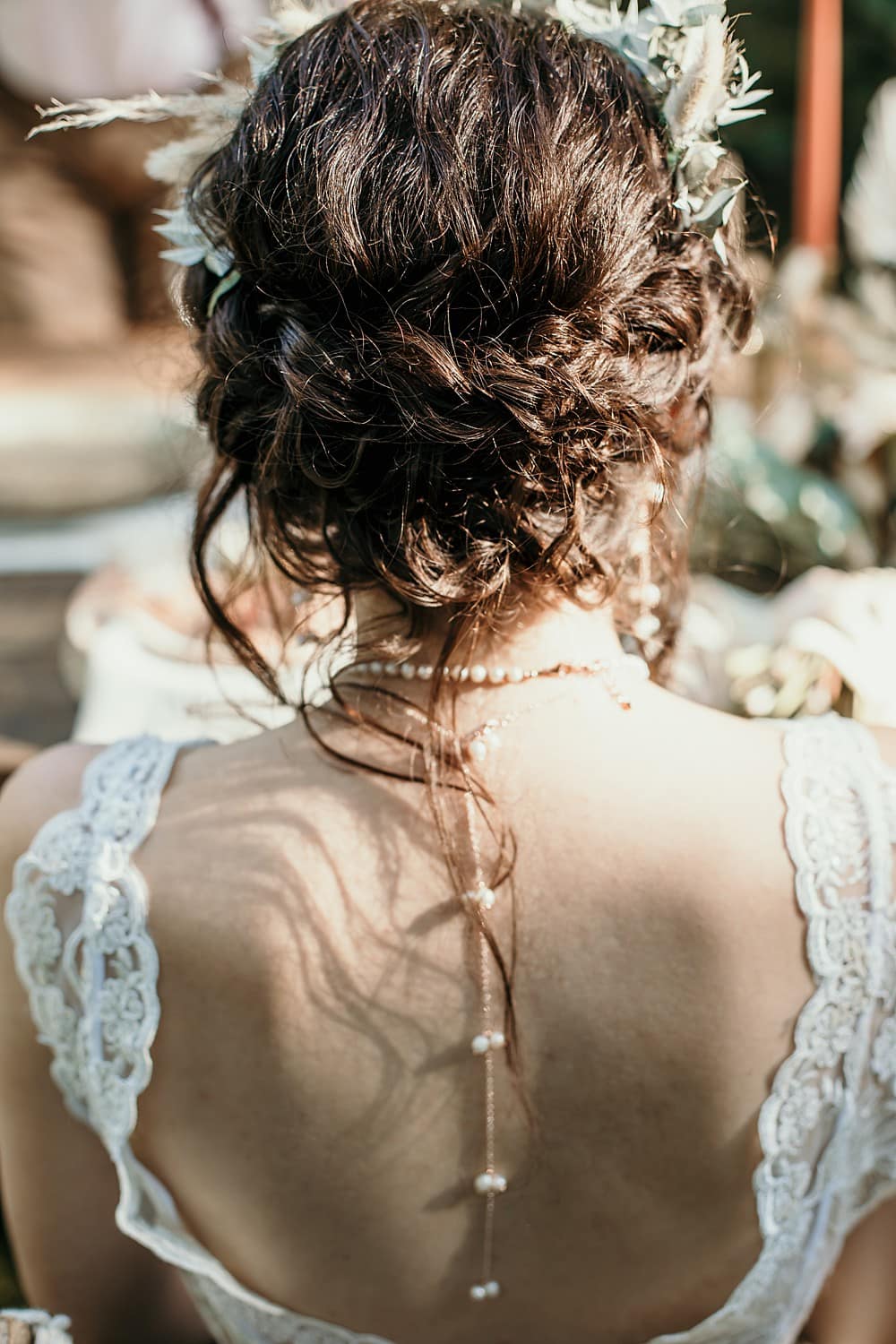 Our bridesmaid model, Heva, wore a burnt golden orange stretch lace wrap dress that beautifully tied in with the colour scheme of the shoot. Sarah-Jane’s gold toned drop necklace, earrings and bracelet with clear Swarovski stones were a complementary addition. Sabina again used warm rusty and neutral tones, just a little more subdued than our Bride’s makeup look and Kirsty went with a relaxed long boho braid, scattered with flowers throughout for an offbeat look.