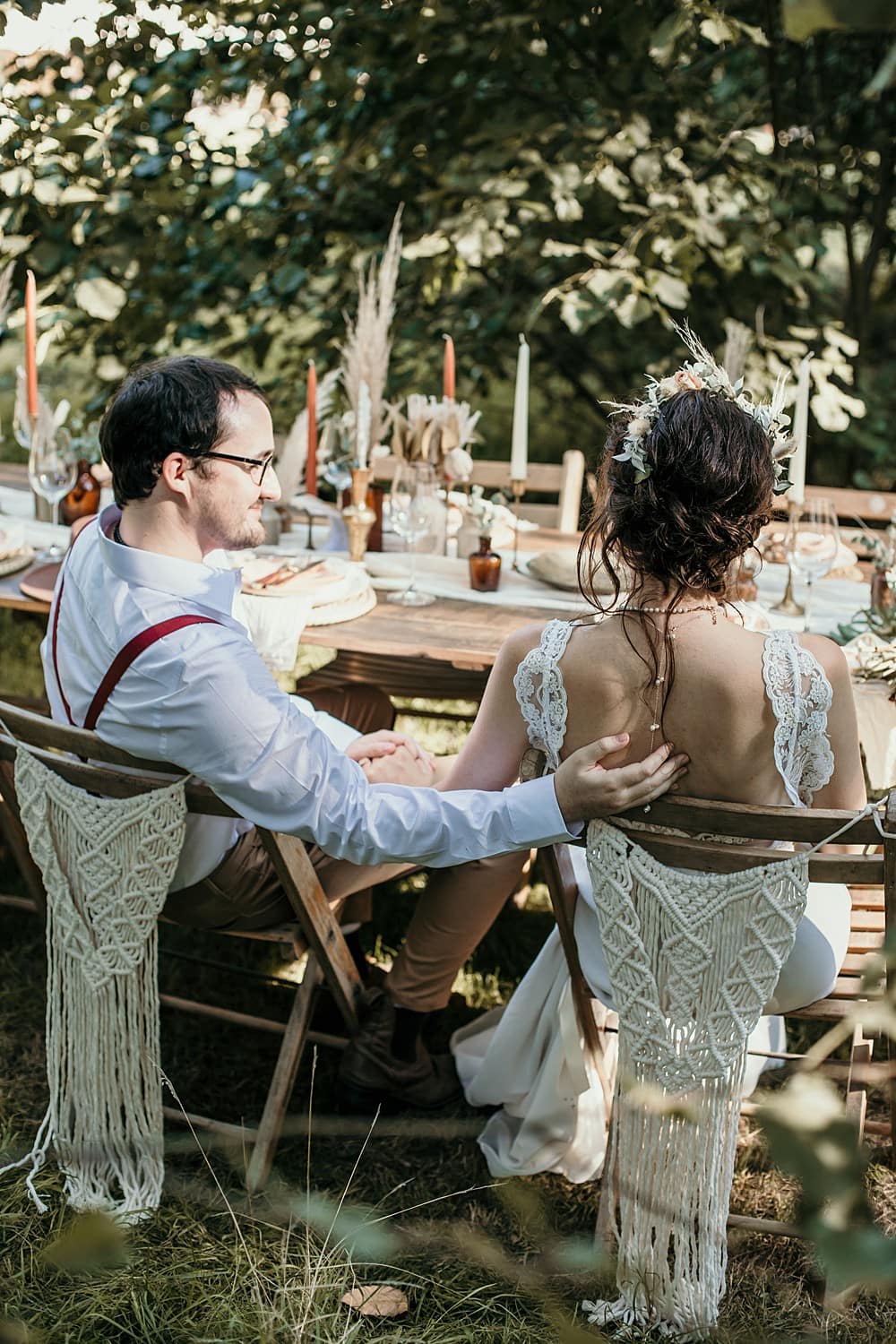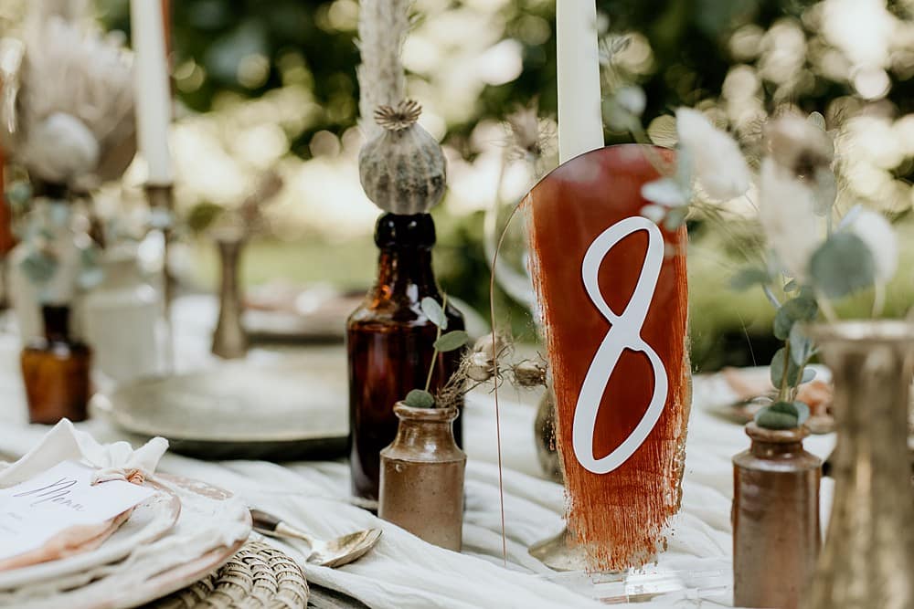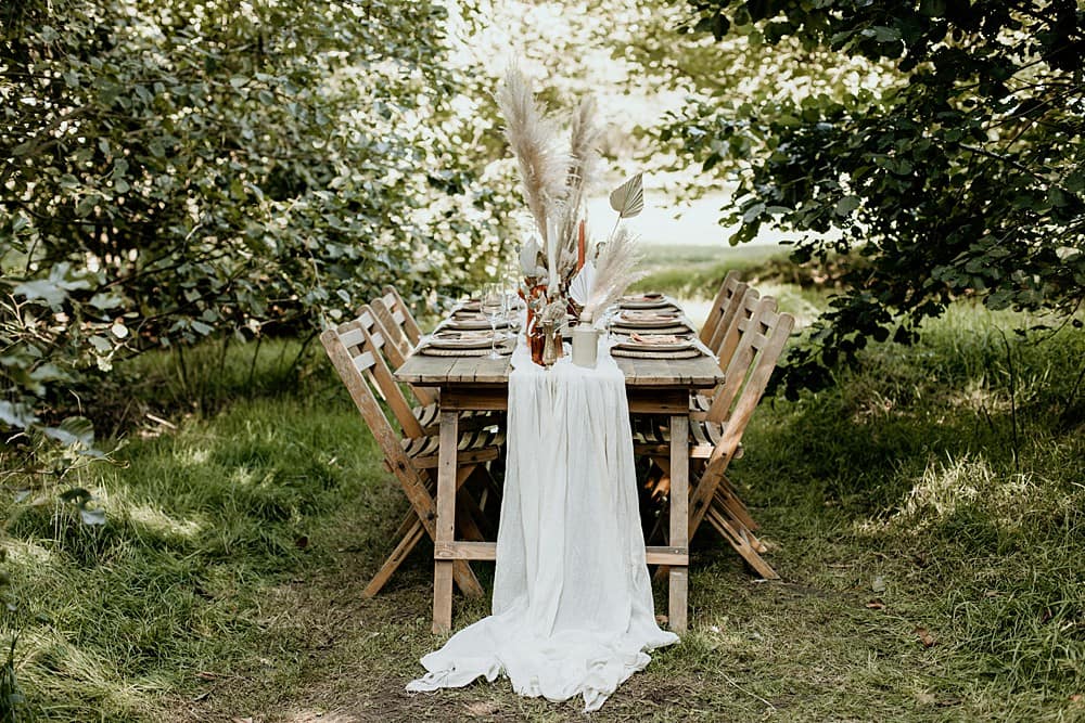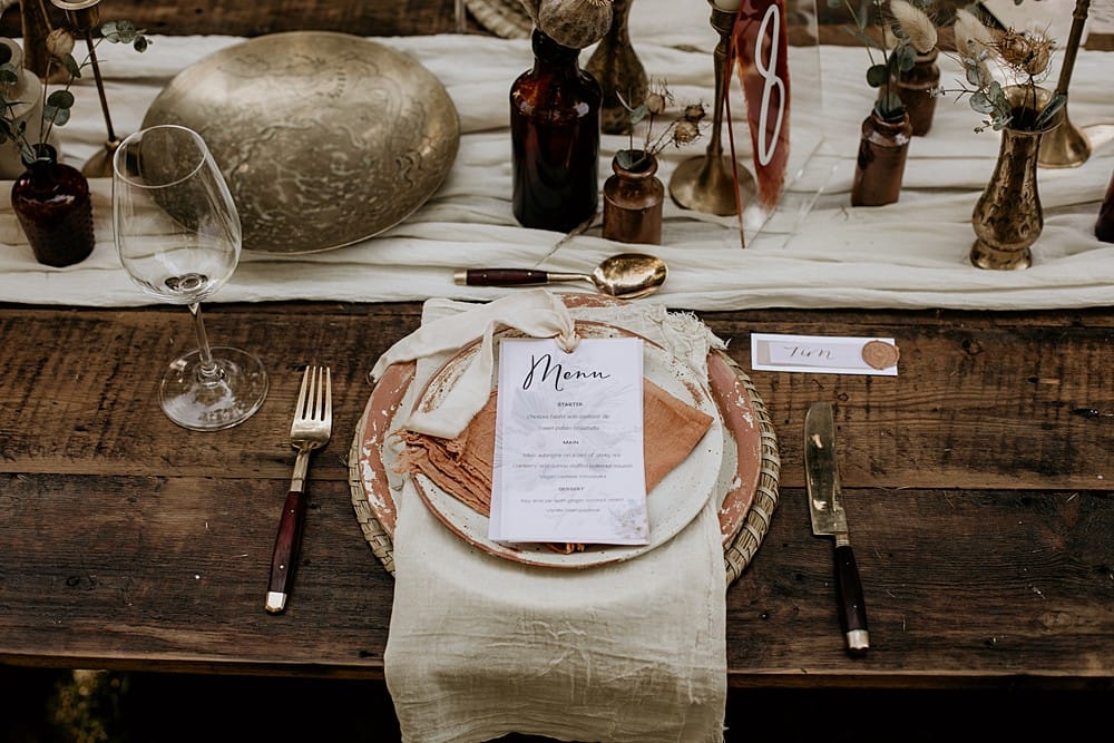 For the dining area, we used scattered brass bud vases, candlesticks and bowls, with pottery bottles on a handmade reclaimed wood trestle table with folding wooden chairs. Vintage brass cutlery was paired with rustic stoneware crockery; the terracotta tones tying into the earthy burnt orange colour scheme. A pair of Rivendor Creations handmade recycled macrame chair tie-backs added to the boho flair of the shoot. Another layer of texture was added with a Mia Sylvia ivory table runner. All of these elements created a beautifully styled table scape, but one that was approachable, relaxed and earthy, perfect for a laid-back couple who love nature.