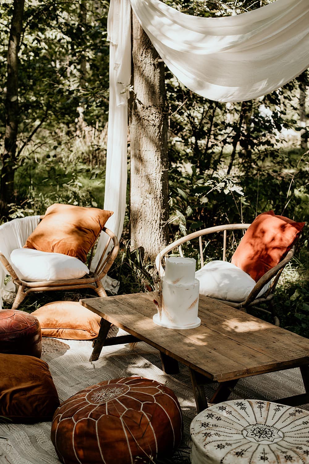 Amy’s low bamboo seating area complete with picnic table, rugs, cushions and ottomans was setup under the tree canopy and framed with more draped linens to create a cosy chill-out area, a great escape for a few moments of reflection for the couple or somewhere to relax and chat with their guests.