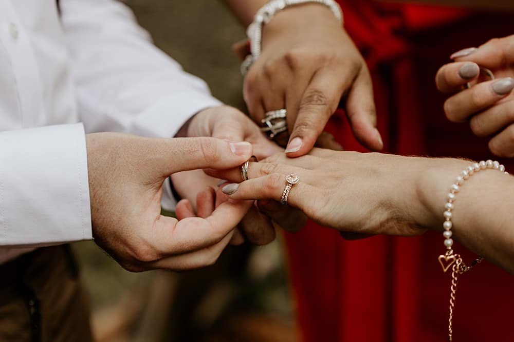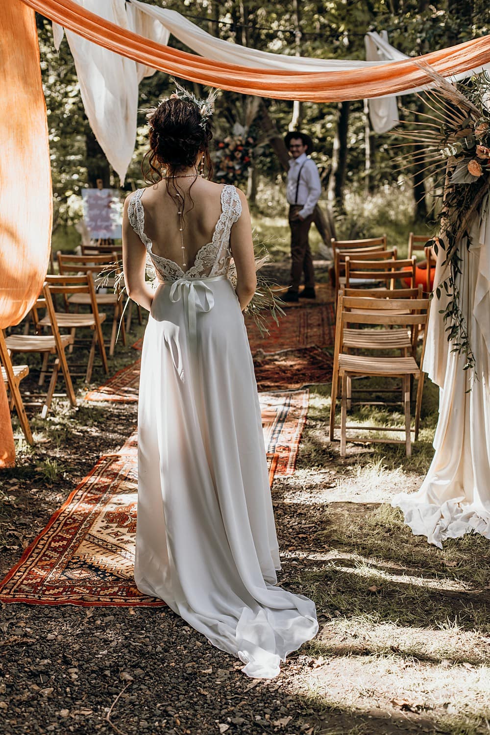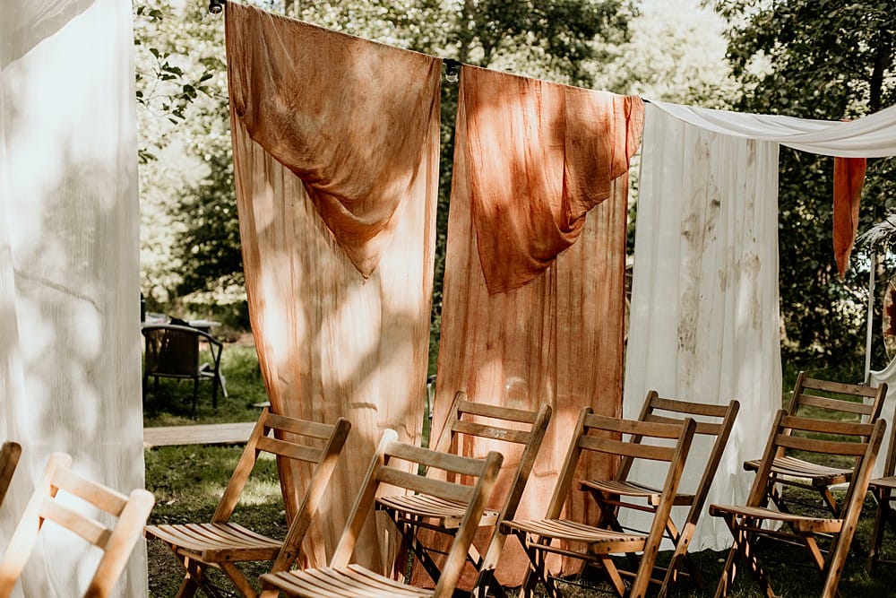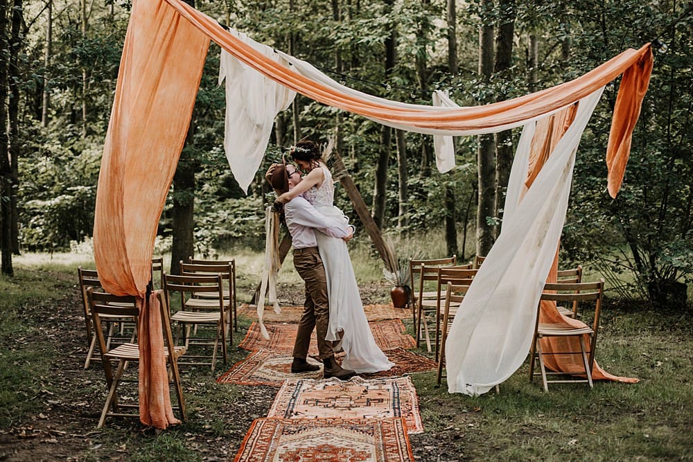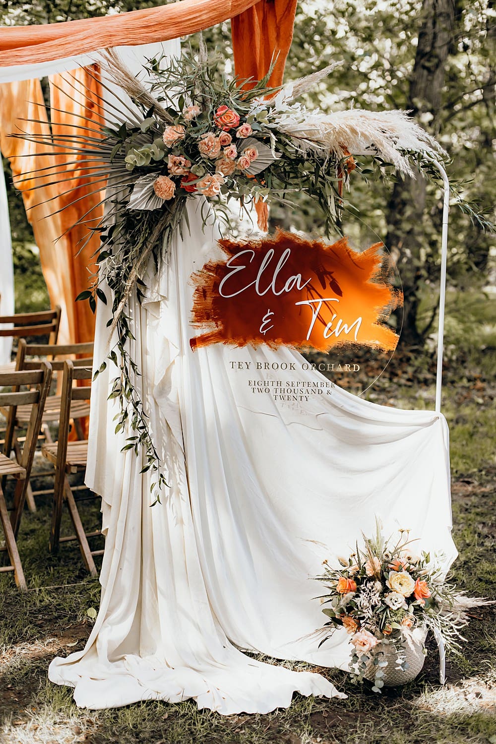 For the ceremony, Mia created a wonderful draping installation, using a mixture of hand-dyed burnt orange, beige and ivory linens that framed the aisle in an earthy and organic way. Persian rugs with orange, beige and brown tones were used in place of an aisle runner and folding wooden chairs placed either side ready for guests to the small woodland wedding. The wooden arch dressed with a mixture of dried and fresh blooms acted as the backdrop to the woodland ceremony led by celebrant Jennifer Patrice. Corlia Creations created a welcome sign with burnt orange to welcome their guests, as well as a lovely quote piece, great for a photo opportunity and displayed on a wooden artists easel.