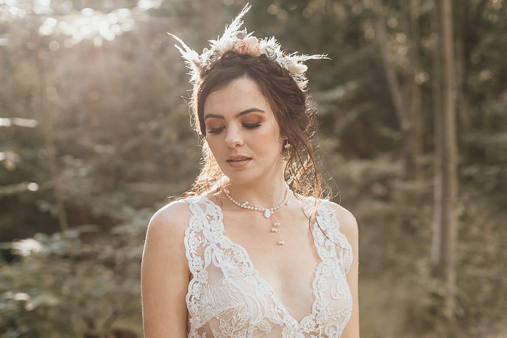 I went with a monochromatic warm autumnal makeup look on our bride model Ella. Rust and burnt orange tones were used on the eyes, blown out and effortless and paired with a warm brown lip. The skin was kept fresh and glowing with a peach liquid blush and cream highlighter echoing the warm sunlight of the late summer afternoon peeking through the tree canopy at Browning Bros. Kirsty, Hair and Makeup by Kirsty, continued the boho vibes on Ella with a textured up do, halo braid and some loose wispy tendrils. Our woodland boho bride’s look was completed with a whimsical flower crown from C Taylor’s Floristry.