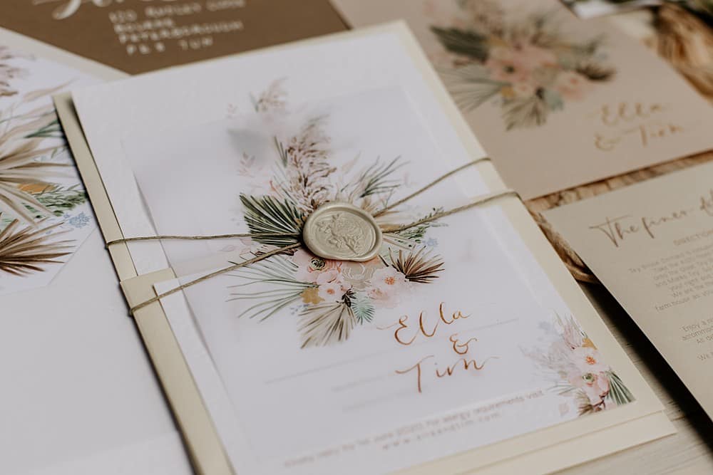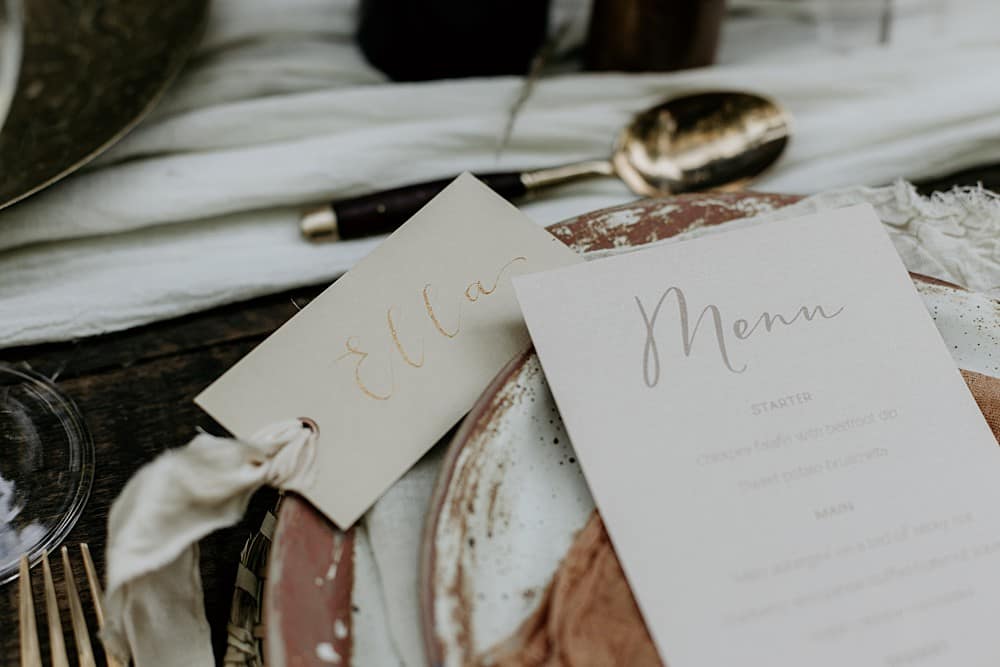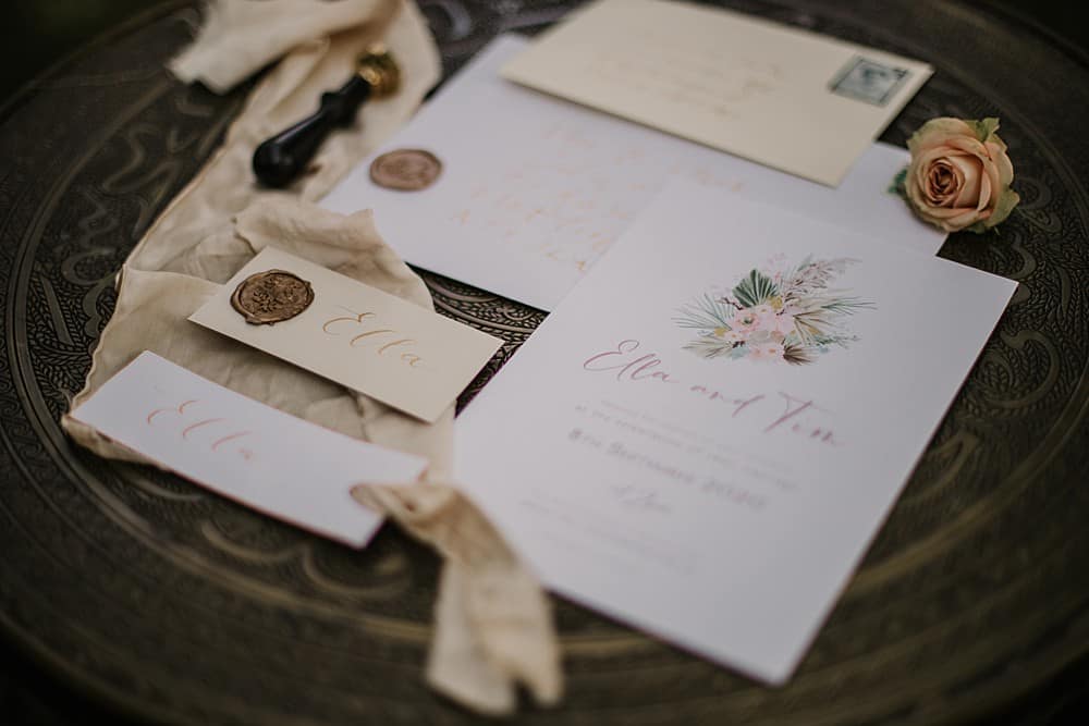 Sharmila Joy designed and made a full stationery suite for the shoot. She used ivory, beige and brown paper with muted floral illustrations that mirrored C Taylor’s Floristry’s creations. Calligraphy and wax seals added to the boho, rustic charm.